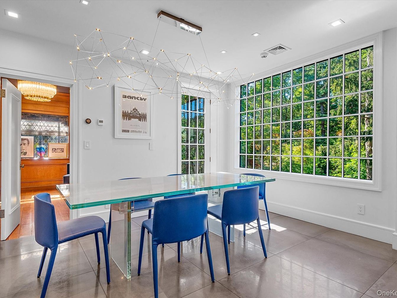 This inviting dining area exudes modern elegance, featuring a sleek glass table surrounded by vibrant blue chairs that add a pop of color against the neutral tones. Large, grid-patterned windows frame the space, flooding it with natural light and showcasing a lush outdoor view, creating a serene connection with nature. Minimalist light fixtures, including a geometric chandelier, contribute to a contemporary atmosphere, while the smooth concrete flooring offers practicality and style. The open layout enhances the feel of spaciousness, with access to a warmly lit adjoining room, ensuring a family-friendly environment perfect for gatherings and everyday dining.