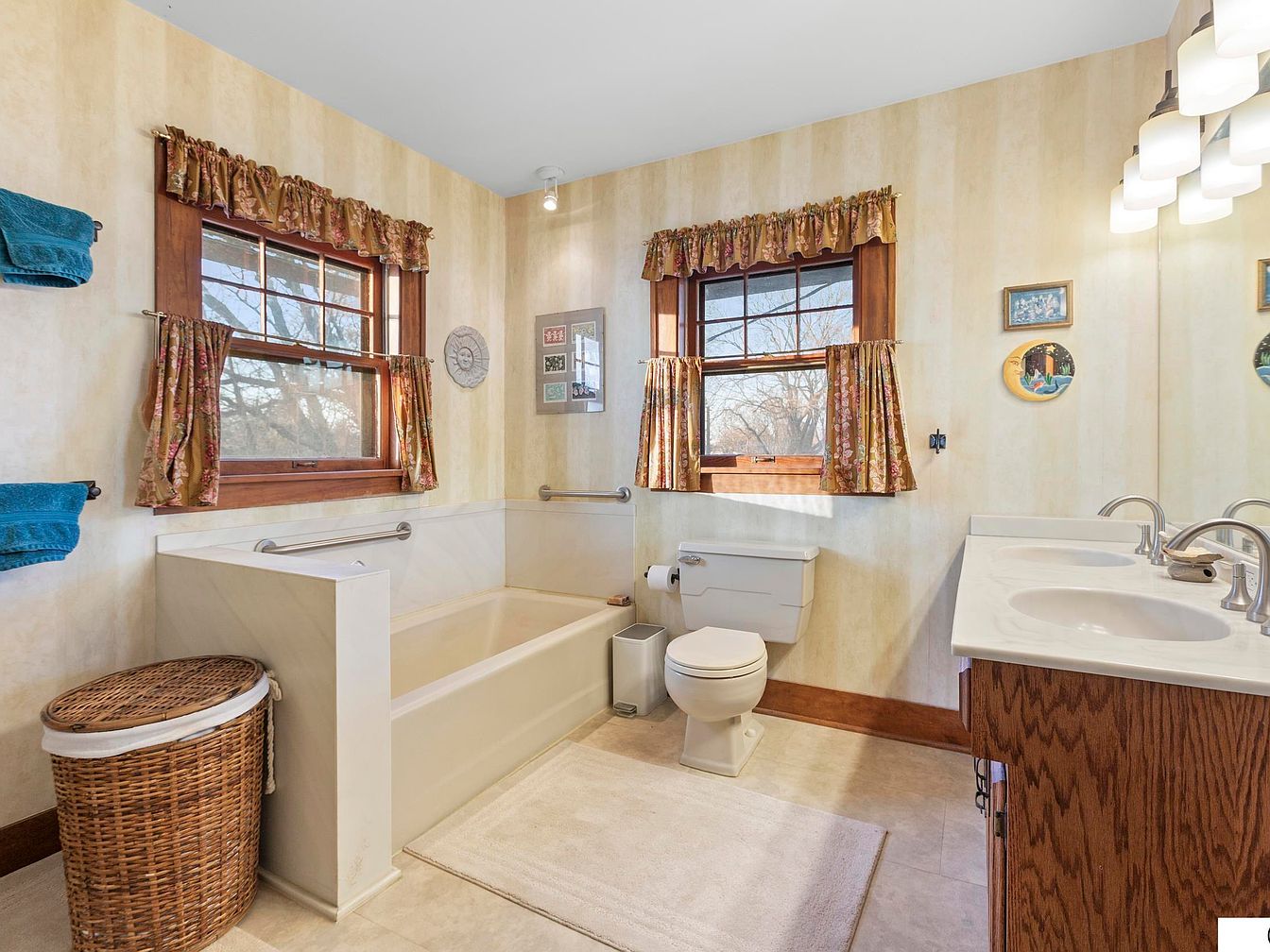This charming bathroom showcases a blend of functionality and warmth. A spacious, sunlit area features a modern tub, accompanied by elegant grab bars for added safety. The soft, cream-colored walls are adorned with subtle stripes, creating an inviting atmosphere. Natural light filters through dual windows, dressed with vibrant floral valances that complement turquoise towels neatly hung on a rack. Elegant wooden vanity cabinets house dual sinks, reflecting a commitment to practicality. The meticulous organization is enhanced by a woven laundry basket, offering a rustic touch. Thoughtfully placed decor adds a personalized feel, perfect for family-friendly use.