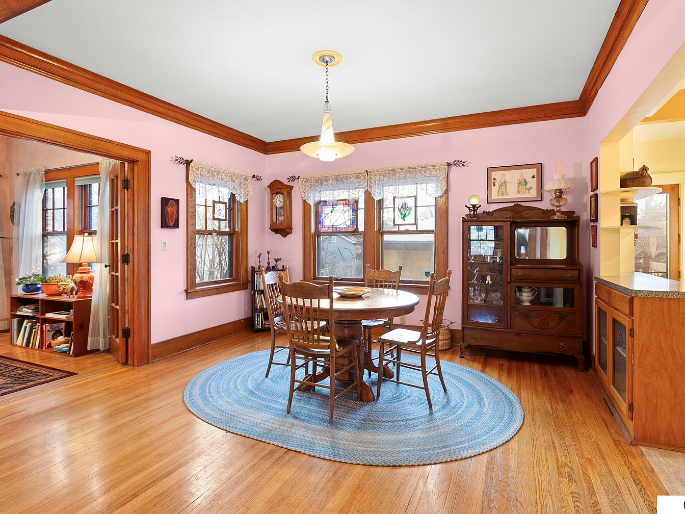 This charming dining room features a harmonious blend of classic and cozy elements, highlighted by soft pink walls and rich wooden trim. A round wooden table surrounded by matching chairs invites family gatherings, while the blue braided rug adds a touch of warmth underfoot. Large windows adorned with lace curtains offer ample natural light, enhancing the inviting atmosphere. Custom touches like stained glass accents and decorative wall art enrich the space, while the antique cabinet showcases collectibles, blending functionality with nostalgia. Perfect for cozy dinners or lively family conversations, this dining area embodies comfort and style.
