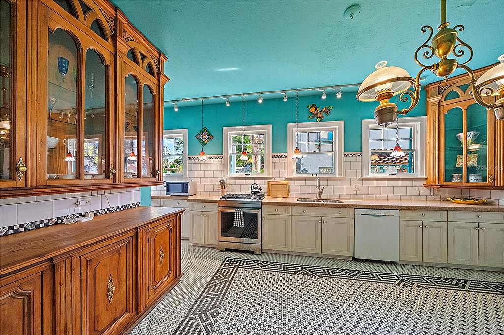 This vibrant kitchen showcases a bright turquoise ceiling that energizes the space, complemented by a classic white tile backsplash. Elegant wooden cabinetry adds a touch of warmth, featuring glass doors that display decorative dishware. The hexagonal patterned black and white floor tiles create a stylish contrast beneath a spacious countertop, enhancing functionality. Thoughtful design elements include vintage pendant lighting and multiple windows, flooding the room with natural light. Family-friendly features, such as ample storage and a seamless layout, make this kitchen both inviting and practical for everyday meal preparation and entertaining activities.
