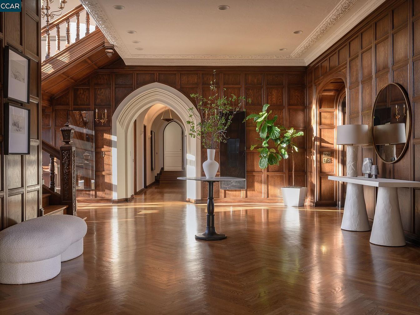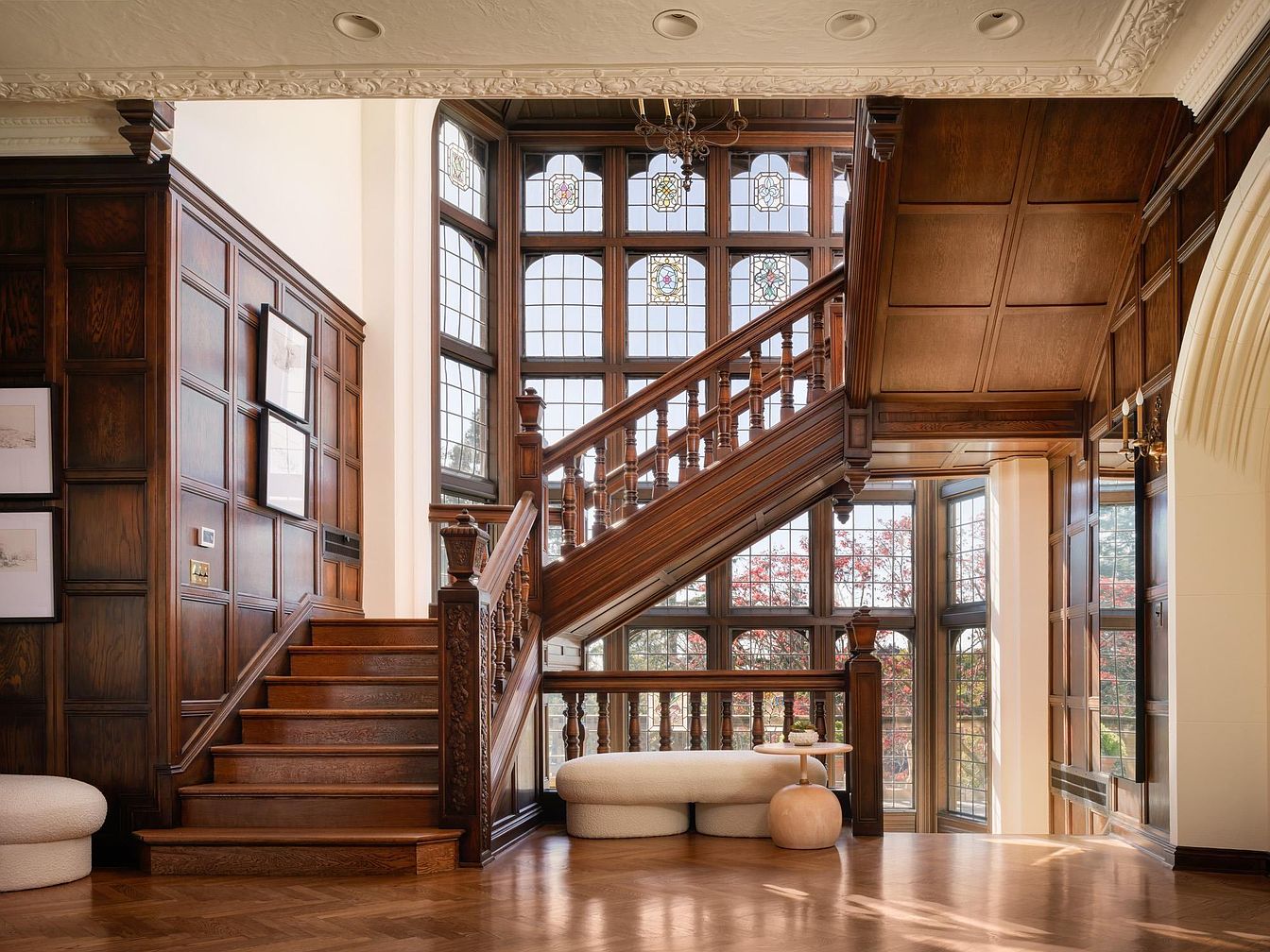 The entryway features stunning wooden paneling, creating a warm and inviting atmosphere. An intricately designed arched doorway leads to a serene outdoor view, while elegant light fixtures add touches of sophistication. The rich, golden tones of the hardwood flooring contrast beautifully against a minimalist round table and soft, sculptural seating, enhancing the family-friendly layout. Large, stained-glass windows flood the space with natural light, highlighting the architectural details of the staircase. This combination of classic craftsmanship and contemporary design creates a welcoming ambience, perfect for gatherings and an inspiring first impression for guests.