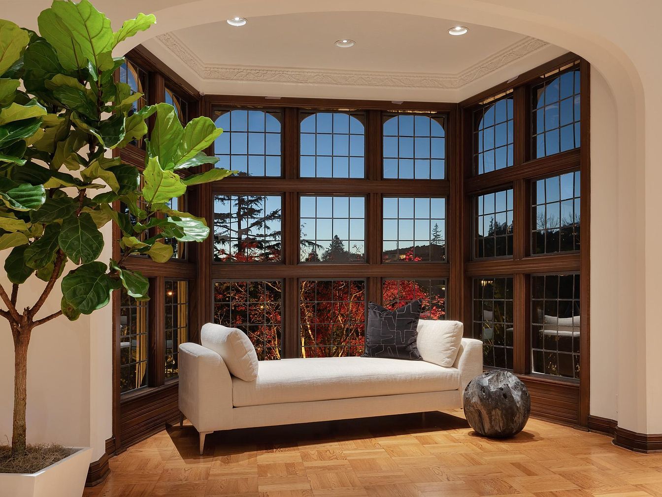 A cozy sunroom invites relaxation with its generous array of tall, mullioned windows that frame picturesque outdoor views, enhancing the space with abundant natural light. The warm wooden accents and intricate crown molding lend elegance, while the rich parquet flooring adds a touch of sophistication. A plush, light-colored chaise lounge serves as a perfect spot to unwind, complementing a bold, patterned throw pillow that adds a splash of personality. A decorative stone accent table ties the room together, and a lush potted plant introduces a vibrant natural element, ensuring this inviting area is ideal for both family gatherings and quiet moments.