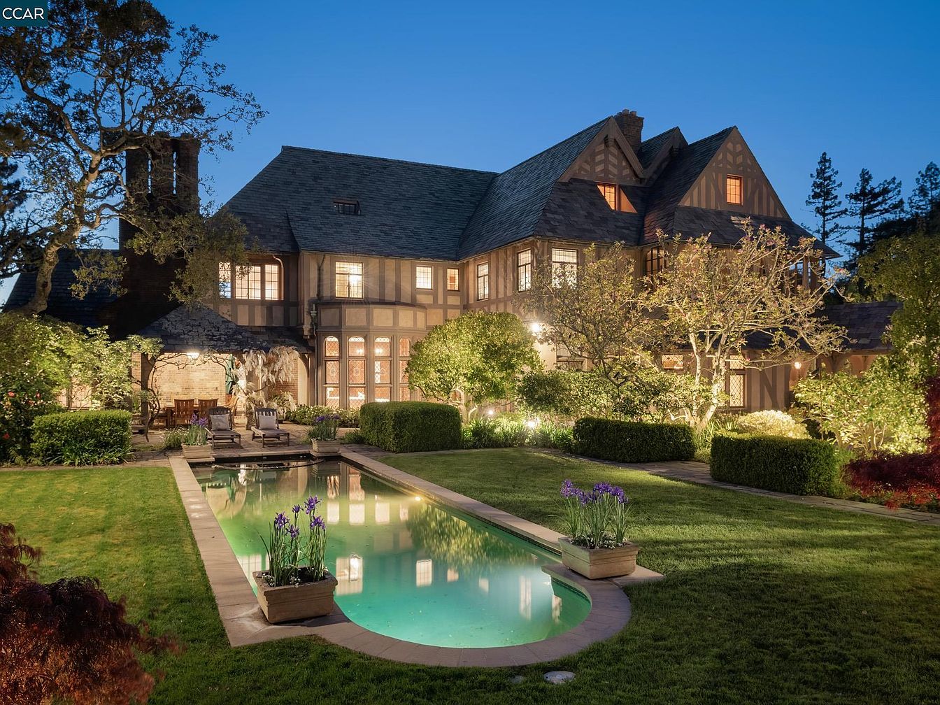 This enchanting garden oasis features a stunning home with rich Tudor architectural details. The inviting façade showcases intricate woodwork and a slate roof, harmonizing with lush greenery. A tranquil swimming pool, flanked by elegant flower planters, reflects the serene ambiance. Comfortable lounge chairs provide a perfect relaxation spot, ideal for family gatherings or peaceful evenings. Surrounding hedges and manicured lawns promote a family-friendly atmosphere, while strategically placed trees offer privacy. The warm glow of evening lights casts a magical spell over the property, making it a picturesque retreat for both entertaining and enjoying quiet moments.