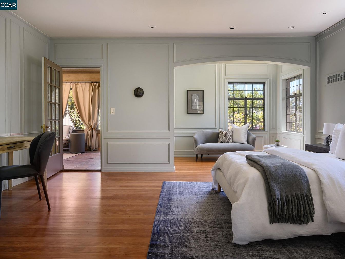 This elegantly designed master bedroom exudes comfort and sophistication with its soft pastel blue walls and rich hardwood flooring. A plush king-sized bed takes center stage, adorned with crisp white linens and a textured gray throw, inviting restful nights. Natural light streams in through dual windows, framing picturesque views of the outdoors. A cozy seating area featuring a stylish gray loveseat and patterned pillows offers a serene nook for reading. The intricate wainscoting adds architectural charm, while the adjacent door leads to a private terrace, enhancing the room’s family-friendly appeal with seamless indoor-outdoor living.