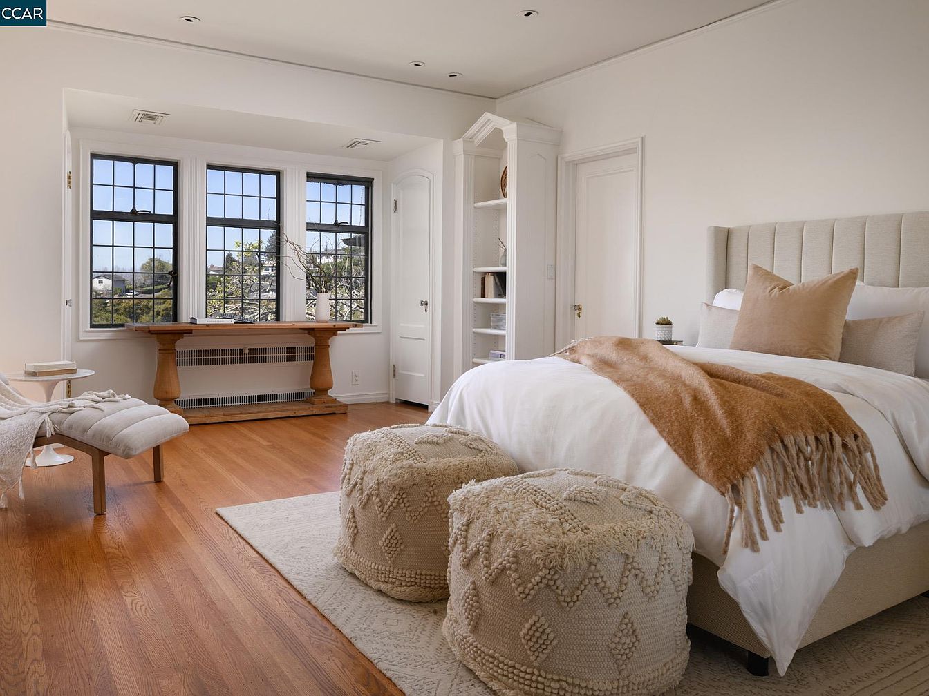 This master bedroom exudes tranquility and elegance with its airy layout and thoughtful design elements. The large windows flood the room with natural light, offering picturesque views, while the warm wooden flooring adds a cozy touch. A plush, upholstered headboard complements the luxurious bedding, layered with a soft, earthy throw blanket. Accent pieces, such as the knitted poufs and sleek side tables, enhance the inviting atmosphere, perfect for relaxation. The neutral color palette, combined with delicate textures, creates a harmonious aesthetic, making this space ideal for unwinding and enjoying restful nights.