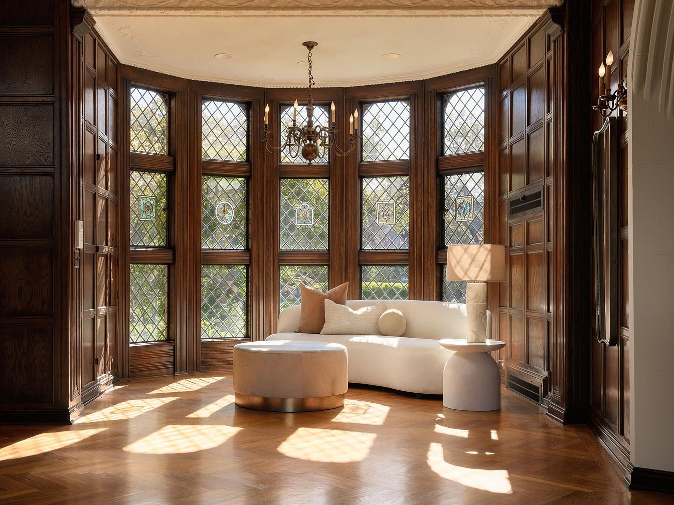 This inviting sitting area features a unique curved design accentuated by large, bay windows, flooding the space with natural light. Rich wooden paneling and intricate moldings create a warm, traditional atmosphere, while the parquet flooring enhances the classic elegance. A plush, modern white sofa adorned with textured pillows complements a stylish circular ottoman, providing comfortable seating for family gatherings. A tasteful lamp adds soft illumination, ideal for cozy evenings. The stained glass details in the windows introduce a touch of artistry, making this charming nook both a functional space and a serene retreat within the home.