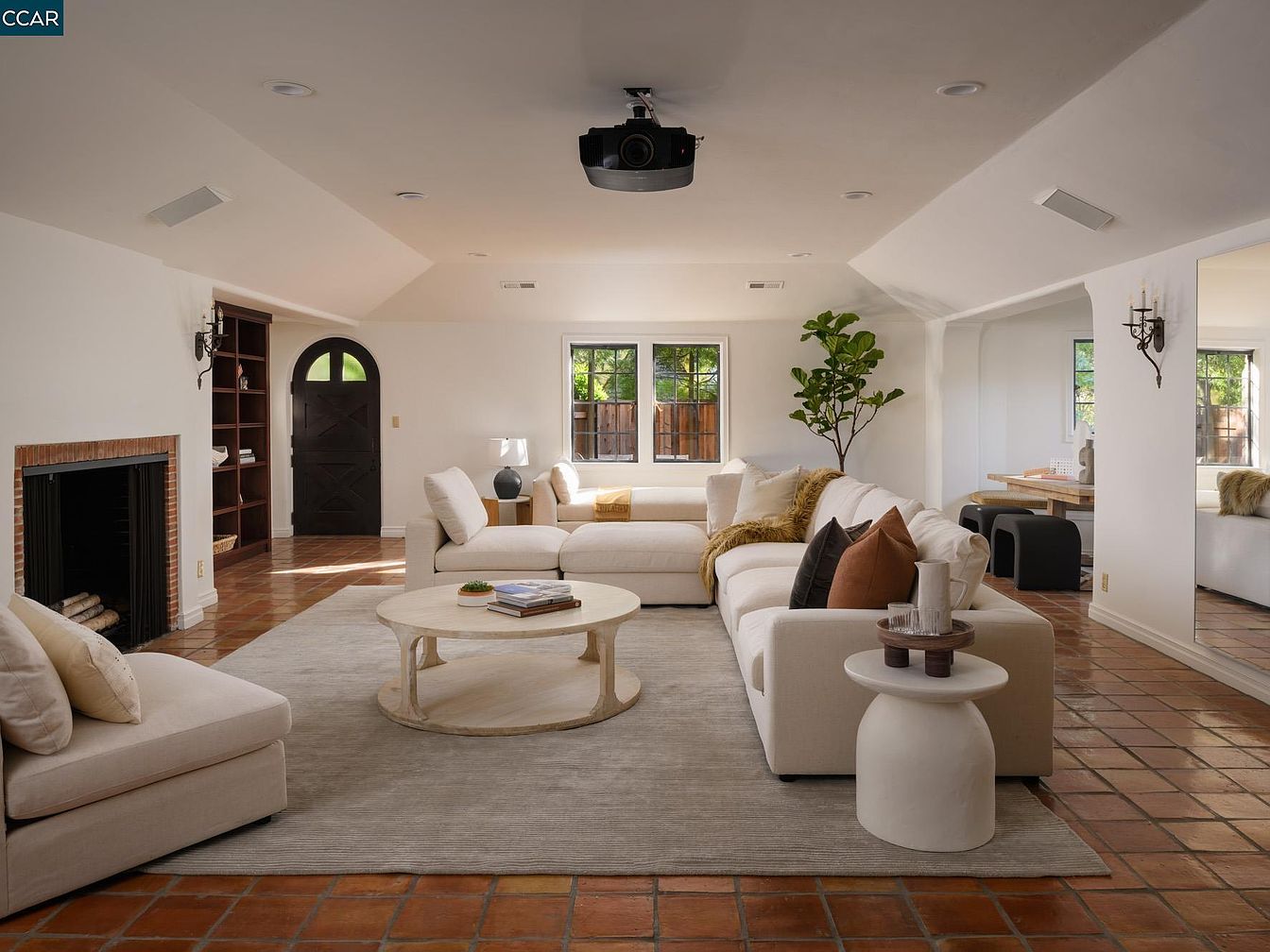 This spacious living room features a cozy, open layout characterized by warm terracotta tiles and soft, neutral tones. A large sectional sofa, adorned with plush throw pillows, invites relaxation and conversation, while a round coffee table anchors the space, ideal for family gatherings. Natural light floods in through multiple windows, highlighted by a simple yet elegant design. Architectural details like a charming arched doorway and a fireplace with traditional brick surround add character. A tall indoor plant and strategically placed décor enhance the welcoming ambiance, making this room perfect for both entertaining guests and enjoying family movie nights.