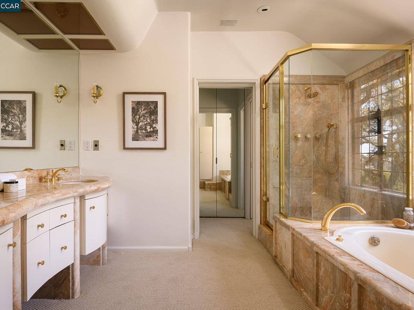 This sophisticated bathroom combines elegance with functionality, featuring a curved vanity with a stunning marble countertop and stylish faucet fixtures. Soft beige carpeting complements the warm tones of the marble tub and shower surround, enhancing the inviting atmosphere. Gold accents are seamlessly integrated throughout, including the fixtures and cabinet knobs, elevating the overall design. Framed nature-inspired artwork adds a touch of tranquility, while the large window provides natural light, creating a bright and airy space. The layout promotes family-friendly use, with ample storage and accessibility, making it a perfect retreat for relaxation and everyday grooming.