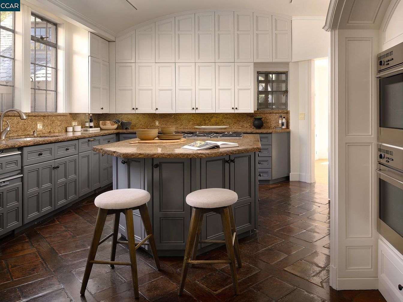 This spacious kitchen features a striking blend of modern and classic design elements. The centerpiece is a large island with a beautifully crafted granite countertop, perfect for family gatherings or casual meals. Rich gray cabinetry contrasts elegantly with crisp white upper cabinets, creating a balanced and inviting atmosphere. Textured tile flooring adds warmth and character while being easy to maintain. Natural light floods the space through tall windows, enhancing the vibrant color palette. Functional details, such as ample storage and built-in appliances, ensure this kitchen is both stylish and highly practical for everyday family life.