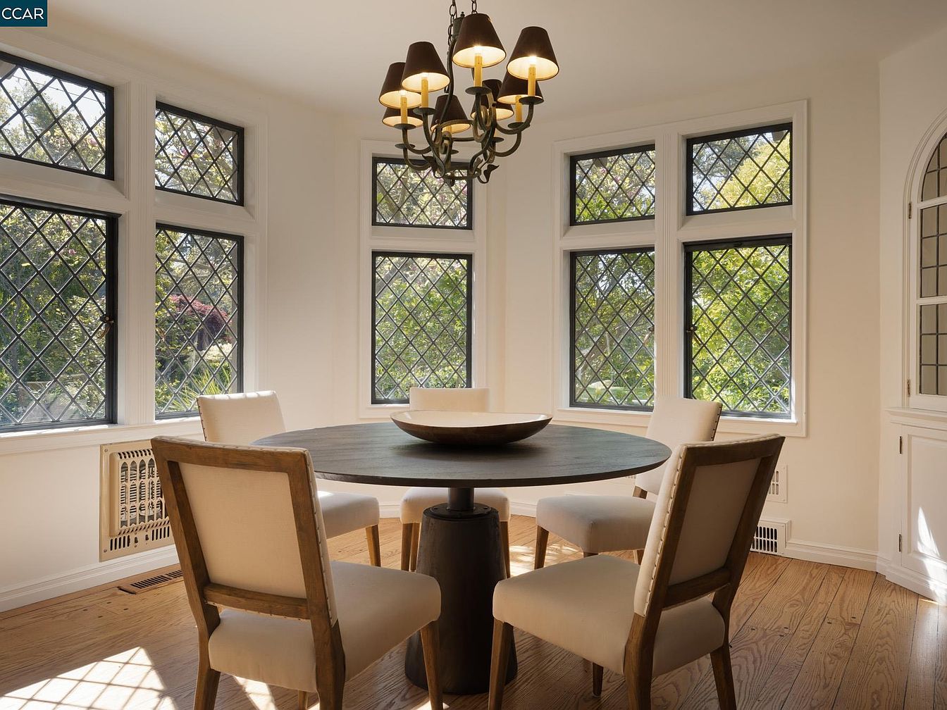 Bathed in natural light, this dining area features a round wooden table surrounded by upholstered chairs, providing a cozy gathering space for family meals. The exquisite diamond-patterned windows not only enhance the room’s charm but also offer scenic views of the outdoors, creating a seamless connection with nature. A sleek chandelier adds a touch of sophistication, balancing the casual atmosphere. The warm wood flooring complements the neutral tones of the walls and furniture, contributing to a welcoming ambiance. Architectural details like crown molding and built-in cabinetry enhance the overall elegance, making it a perfect setting for unforgettable moments.