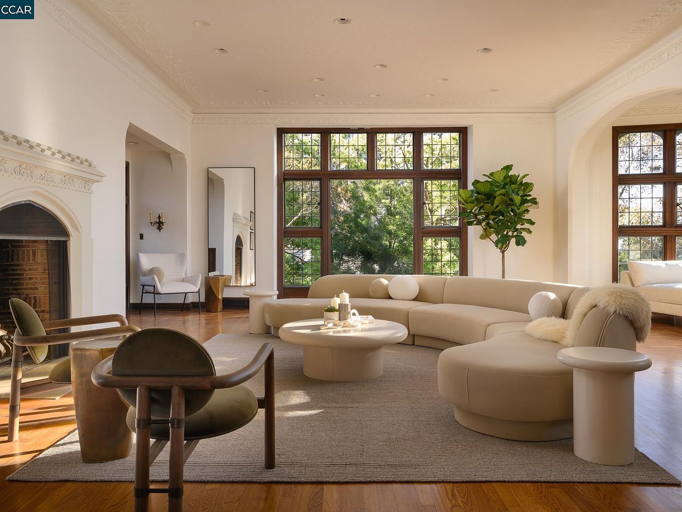 This inviting living space features a harmonious blend of modern elegance and timeless charm. A spacious layout highlights a chic, curved sectional sofa in soft beige, offering ample seating for family gatherings. Large windows flood the room with natural light, accentuating the warm wooden floors and intricate ceiling details. The decor includes stylish accent chairs and a minimalist coffee table, fostering a relaxed atmosphere. A decorative fireplace adds a cozy touch, while a decorative plant enhances the room’s vibrancy. Soft textures and a neutral color palette create a soothing environment ideal for family bonding and entertaining.