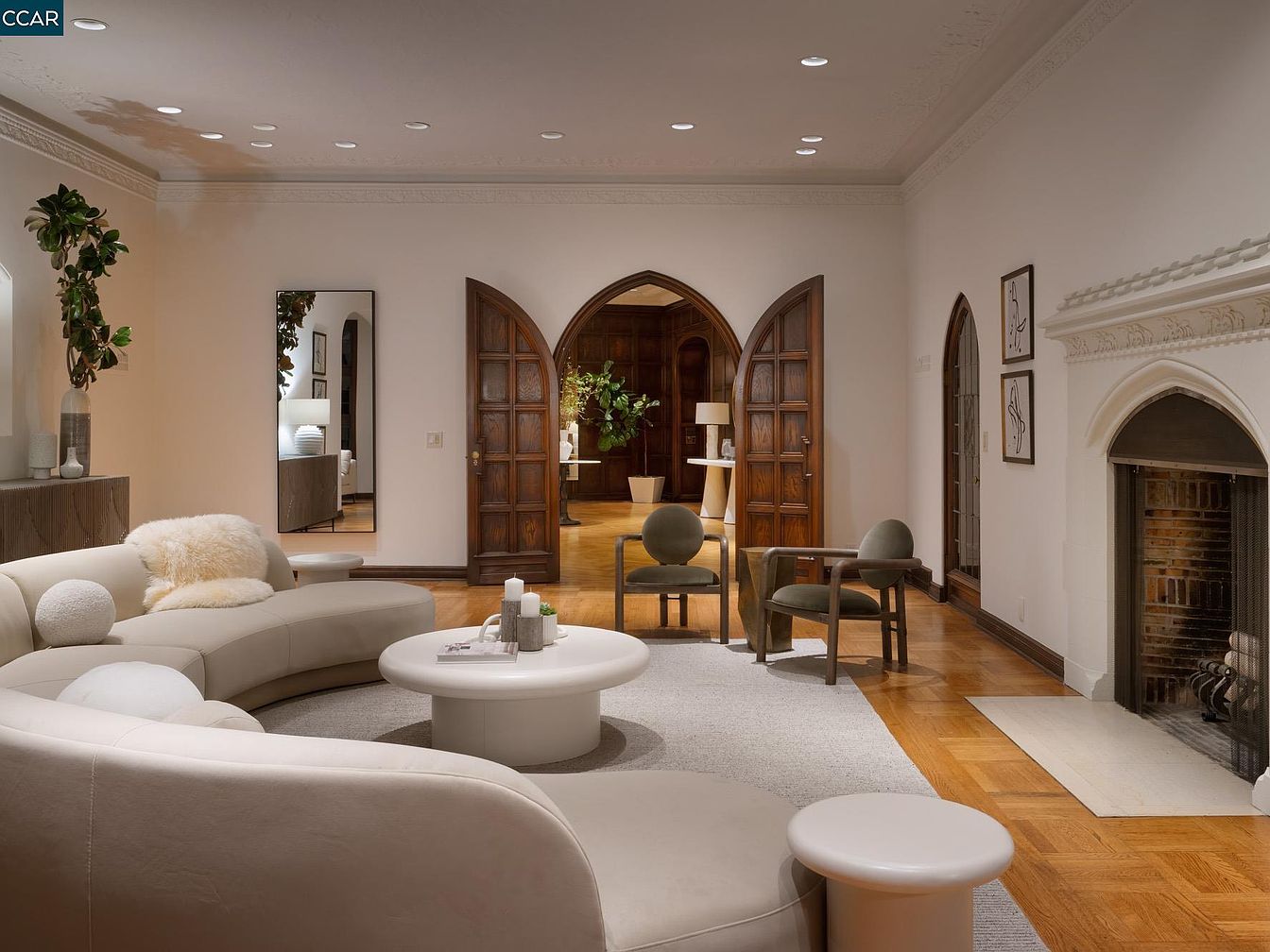 This inviting living room features a seamless blend of modern and traditional elements. The curved, white leather sofa creates a cozy gathering space, inviting relaxation and conversation. Complemented by plush, textured cushions, the decor emphasizes comfort. Rich wooden archways offer an architectural contrast, showcasing craftsmanship and warmth. The elegant, circular coffee table and light-colored area rug provide a contemporary feel, enhancing the bright ambiance created by recessed lighting. Decorative plants add a touch of nature, while the classic fireplace serves as a focal point, perfect for family gatherings, enriching the room’s welcoming atmosphere.