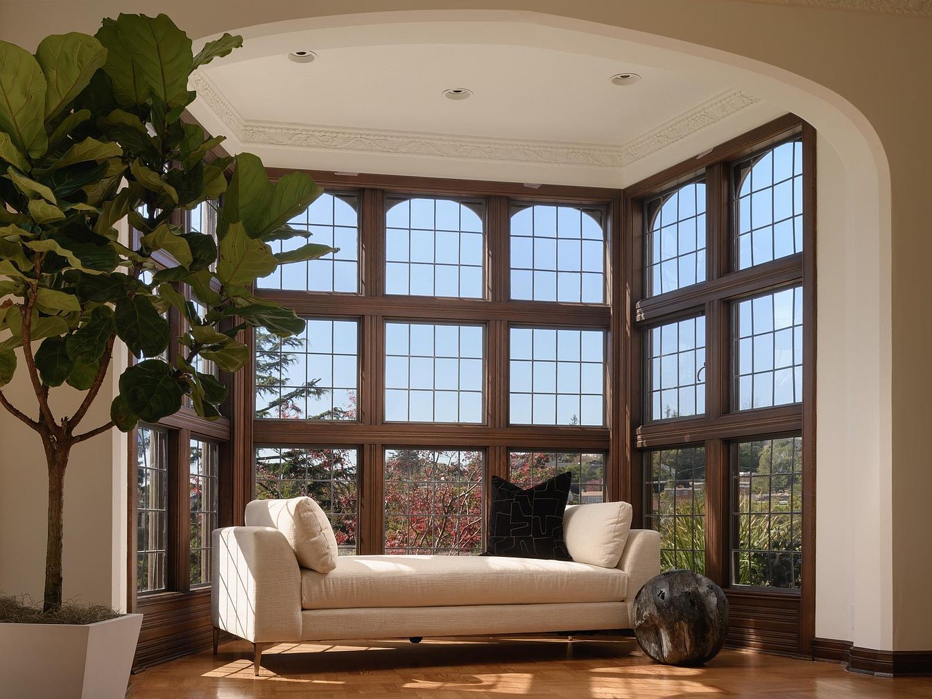This sunroom beautifully merges indoor comfort with outdoor views, featuring an elegant combination of large, divided-light windows that allow natural light to flood the space. The warm wooden accents enhance the architectural charm, while the light-toned couch invites relaxation. A plush black throw pillow adds a touch of contrast and modernity. The corner boasts a stylish fiddle leaf fig tree in a contemporary planter, introducing a hint of nature. Classic crown molding and polished hardwood flooring contribute to the inviting atmosphere, making this retreat perfect for reading, unwinding, or entertaining family and friends in a cozy ambiance.