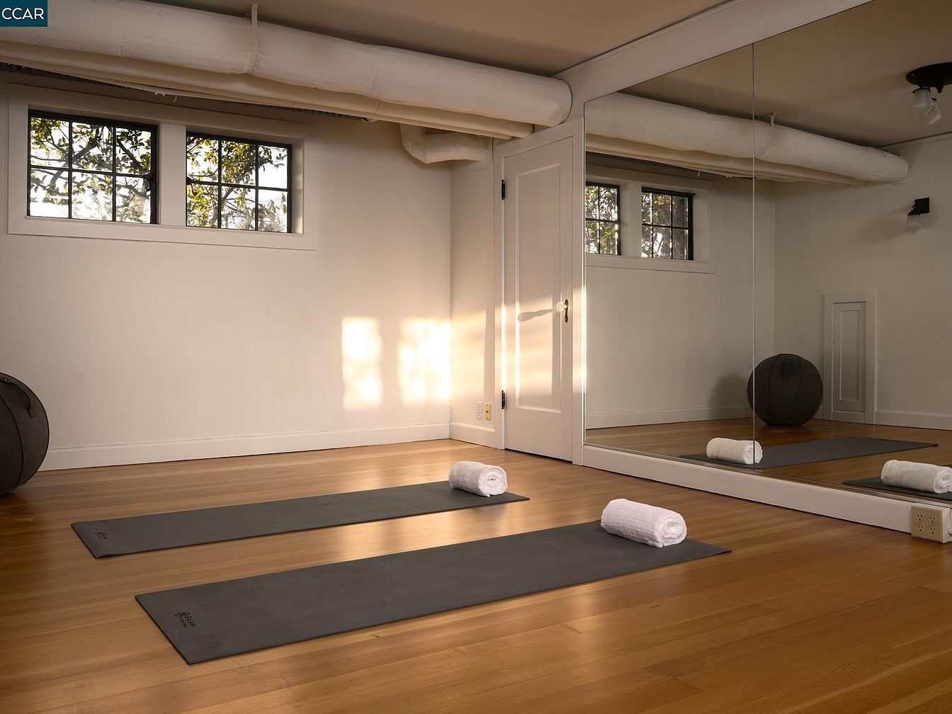 This inviting home gym features a serene atmosphere ideal for wellness and fitness. The room is designed with large windows letting in natural light, creating a bright and airy feel. Light wooden floors complement the soft, neutral wall color, enhancing the calm ambiance. Two yoga mats are meticulously placed on the floor, each topped with rolled towels for convenience. A full-length mirror on one wall enhances spatial perception and encourages practice. The room also includes a snug ball for versatility in workouts. Overall, this space promotes health, relaxation, and an active lifestyle for the entire family.