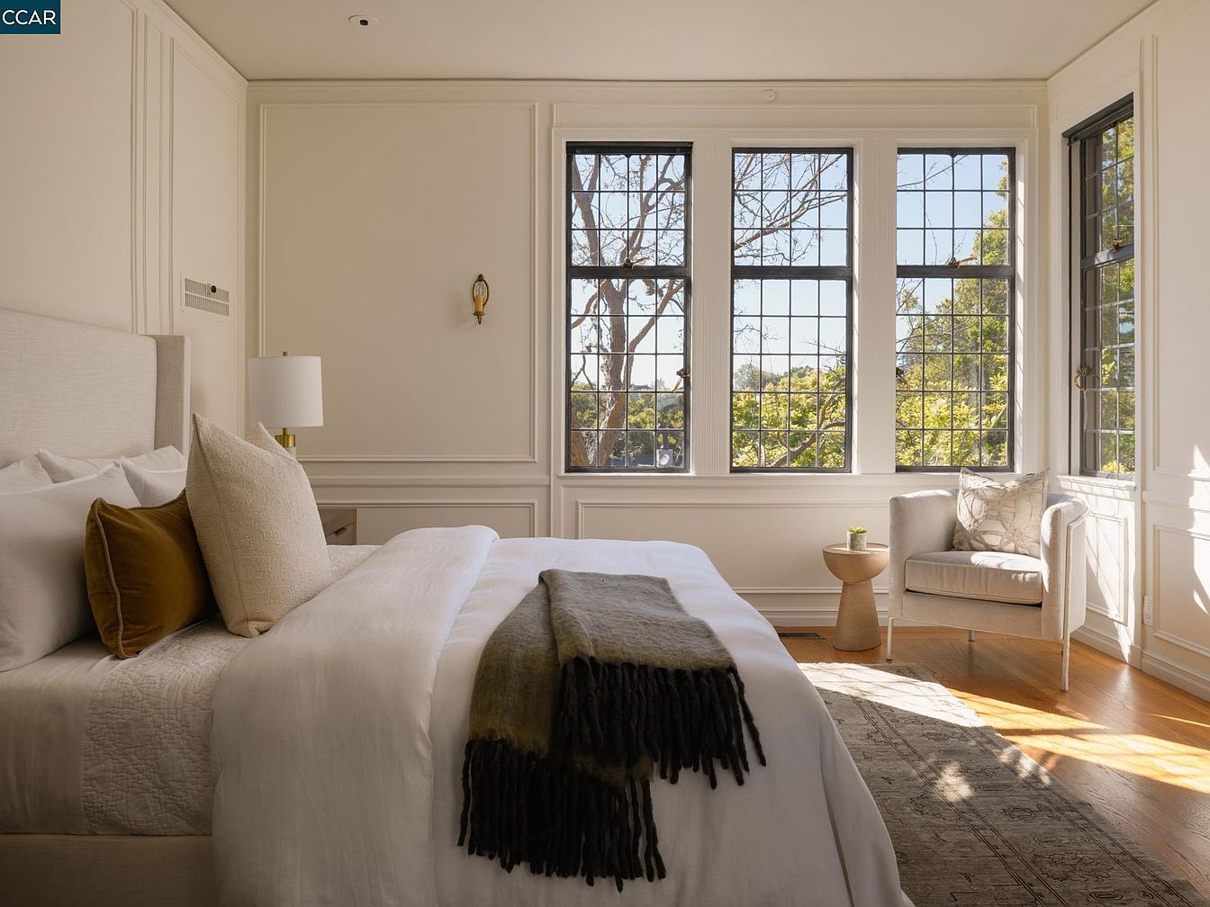 This serene master bedroom exudes elegance with its light color palette and architectural details. A plush king-sized bed, adorned with soft white linens and accent pillows in muted tones, invites relaxation. Large windows frame picturesque views, allowing natural light to flood the space while offering a connection to the outdoors. A cozy reading nook is created with a stylish armchair and a round accent table, perfect for enjoying morning coffee. The hardwood floors add warmth, while the intricate wall paneling enhances the room’s sophistication. This bedroom combines comfort and refined aesthetics, making it a perfect sanctuary for unwinding.