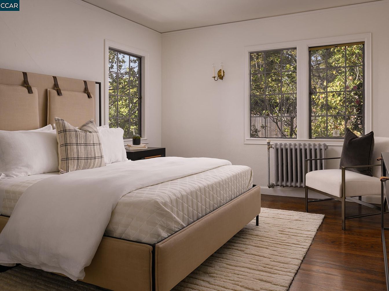 This elegant master bedroom features a serene color palette of soft whites and neutral tones, creating a calming atmosphere. The plush bed, dressed in luxurious linens, is complemented by an oversized patterned pillow that adds a touch of character. Natural light floods the room through large, multi-pane windows, bringing a glimpse of the lush outdoor surrounds. A sleek wooden nightstand offers functionality, while a contemporary armchair in the corner invites relaxation. Hardwood flooring, paired with a textured area rug, enhances the cozy, welcoming feel. Architectural details like the stylish wall sconces add warmth and sophistication, ideal for restful nights.