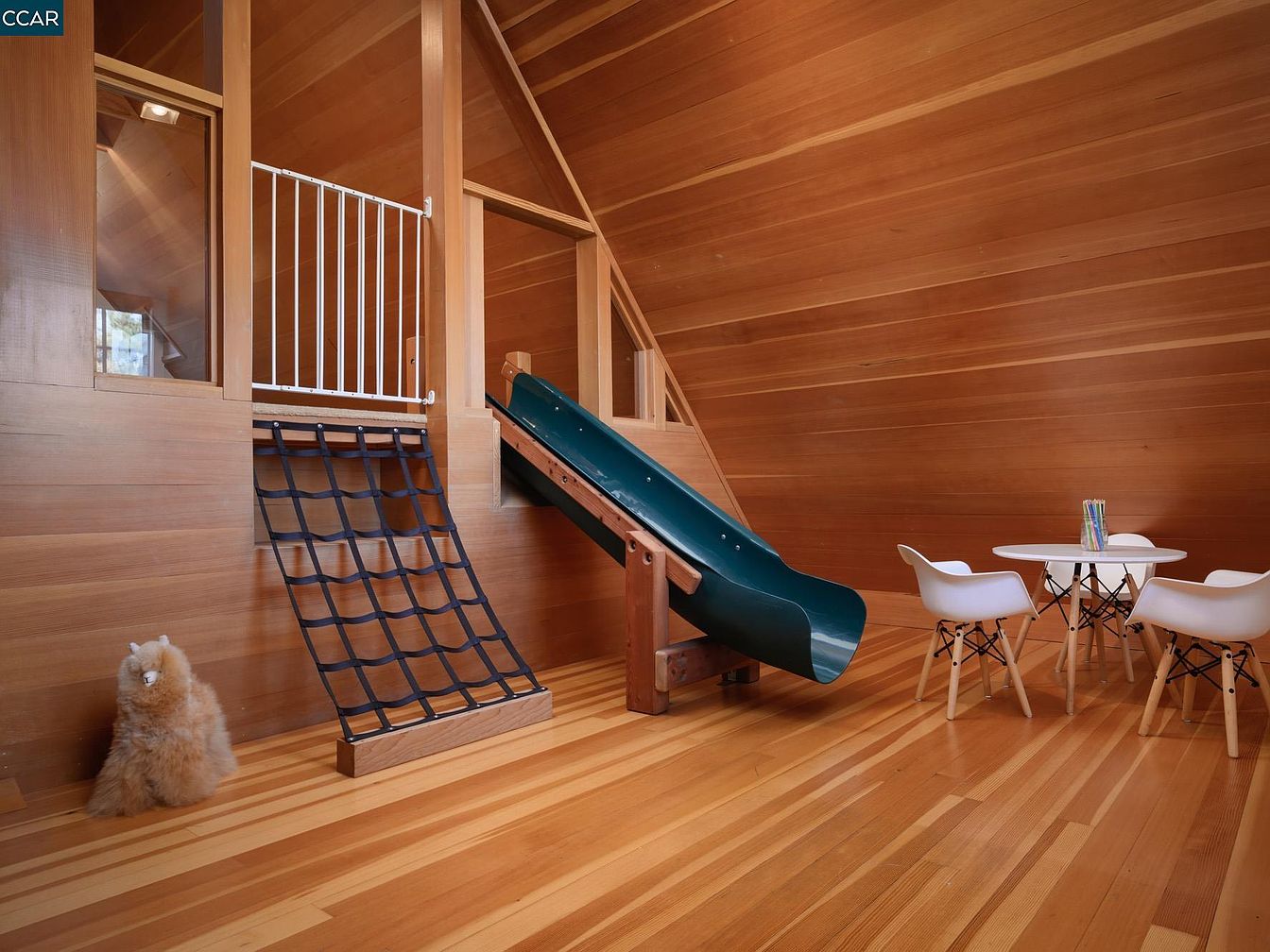 This vibrant kids’ play area combines fun and functionality within a cozy design. The space features a natural wood aesthetic, highlighted by warm wooden walls and sleek hardwood flooring, creating a harmonious and inviting atmosphere. A spiral slide and climbing ramp offer playful excitement, designed for young adventurers, while a safety gate ensures peace of mind for parents. A small round table surrounded by stylish white chairs provides a perfect spot for creative activities or snacks. This room brilliantly embodies family-friendly design, merging modern aesthetics with imaginative play, fostering joy and creativity in daily life.
