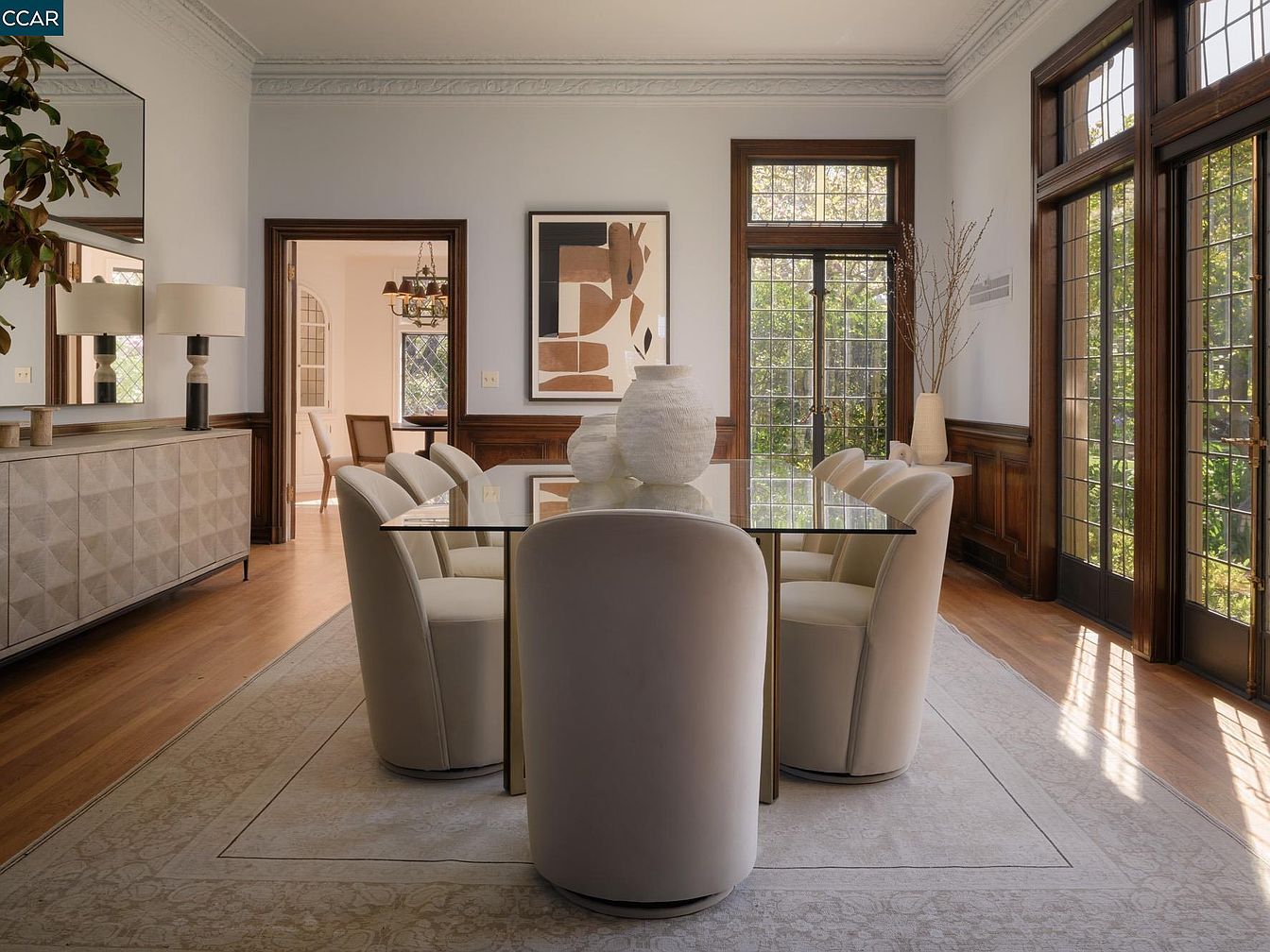A beautifully designed dining room featuring a modern glass table surrounded by plush, cream-colored chairs that invite comfort and conversation. The warm tones of the hardwood flooring harmonize with rich wooden paneling, creating a sophisticated yet cozy atmosphere. Large windows bathe the space in natural light, complemented by decorative vases and a stylish sideboard, enriching the aesthetic. Architectural details, such as crown molding and intricate ceiling designs, highlight the home’s elegance. This inviting area encourages family gatherings and entertaining, exemplifying a harmonious blend of style and functionality for contemporary living.