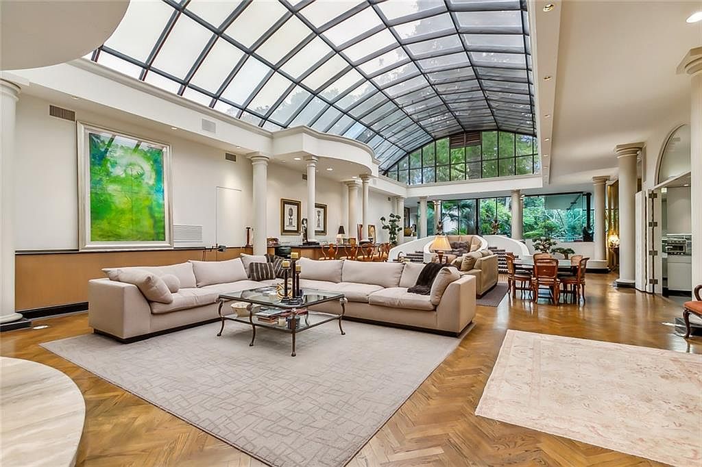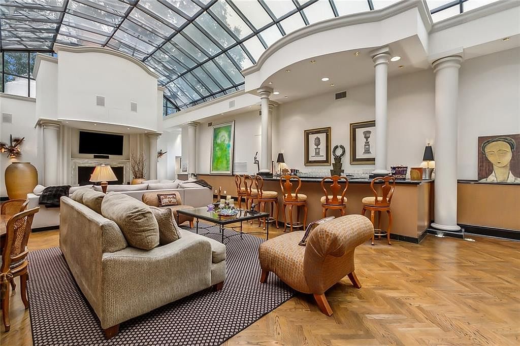 A grand, open-concept living room blends seamlessly with a stylish bar area, highlighted by sweeping columns and a breathtaking glass ceiling that bathes the space in natural light. Plush neutral-toned sectional seating offers ample room for family gatherings and relaxed lounging, while a patterned rug anchors the space for added comfort. Thoughtful decor, including vivid artwork and contemporary sculptures, enhances the elegant, welcoming ambiance. The adjacent bar features classic wooden stools and granite counters, perfect for entertaining guests or casual family meals. Warm wood flooring and soft accent lighting complement the room’s airy, sophisticated atmosphere, making it ideal for all ages.