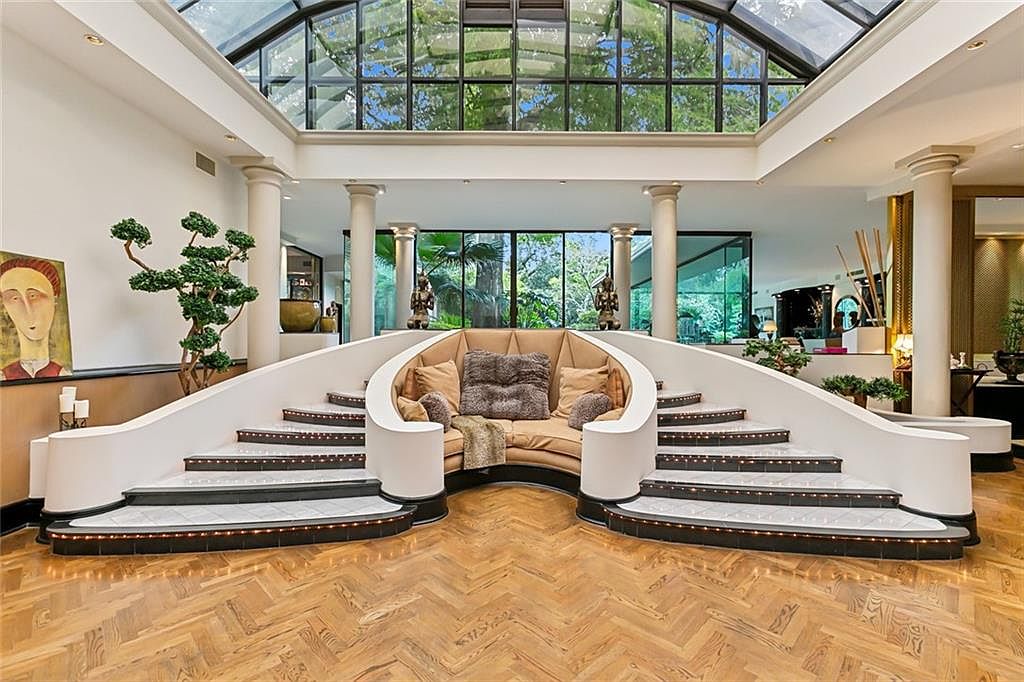 A stunning sunken seating area showcases a blend of contemporary style and comfort, ideal for family gatherings and relaxation. This unique architectural feature is framed by elegant curved staircases and broad white railings, leading down to a plush, circular built-in sofa adorned with soft neutral and gray pillows. Floor-to-ceiling windows and a dramatic glass ceiling flood the space with natural light, connecting indoors to the greenery outside. The space exudes warmth with its chevron-patterned hardwood floors and contrasting modern décor. Decorative columns and curated art pieces add a touch of sophistication, making this space inviting for all ages.