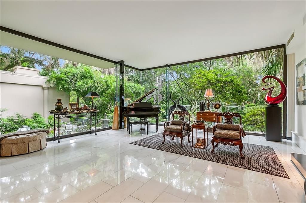 Expansive floor-to-ceiling glass walls bathe this relaxing lounge space in natural light while offering breathtaking views of the lush, private garden. The neutral marble tile flooring amplifies the brightness and provides easy upkeep, perfect for family living. Sitting atop a patterned area rug, elegant antique chairs and a matching desk evoke classical charm. An inviting grand piano sits in the corner, ideal for gatherings and encouraging creativity for children or adults. Artful décor, including sculptural pieces and tastefully arranged collectibles, lend a sophisticated touch. The layout feels open and peaceful, welcoming for family conversations, playtime, or serene reading sessions.