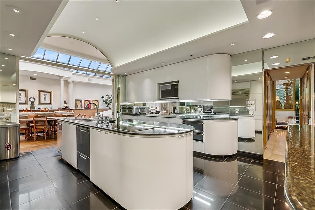 This contemporary kitchen seamlessly blends into a spacious dining area, enhanced by a striking arched skylight that floods the space with natural light. Sleek, white cabinetry with clean lines and glossy black countertops create a polished, modern vibe. The layout is both practical and stylish, with generous countertop space for meal prep and social gatherings. Family-friendly elements like the open flow to the dining area and ample seating make it perfect for hosting dinners or helping kids with homework. Black tile flooring adds sophistication, while subtle lighting and mirrored backsplashes elevate the airy, welcoming ambiance of this heart-of-the-home space.