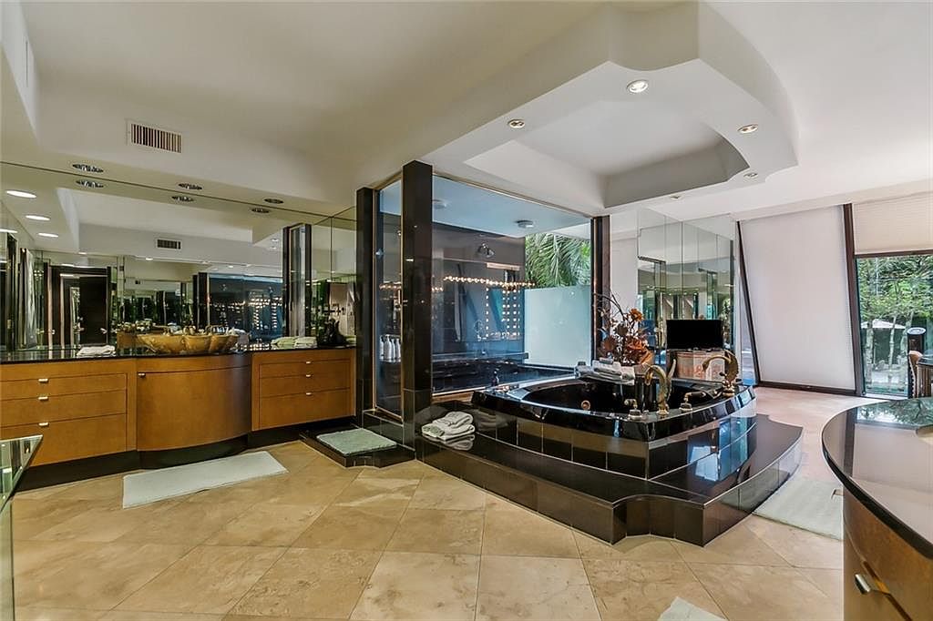 Spacious and contemporary, this luxurious bathroom suite features a stunning black-tiled sunken soaking tub set as a dramatic centerpiece, with mirrored walls expanding the sense of space. Warm wood cabinetry lines the walls, providing ample storage for families, while double vanities and vessel sinks add a touch of modern elegance. Large windows allow natural light to flow in and show off lush greenery outside, creating a private oasis vibe. Neutral marble flooring balances the bold elements, and recessed lighting in the tray ceiling highlights the architectural drama. The layout offers comfort and convenience, perfect for relaxing and family routines alike.