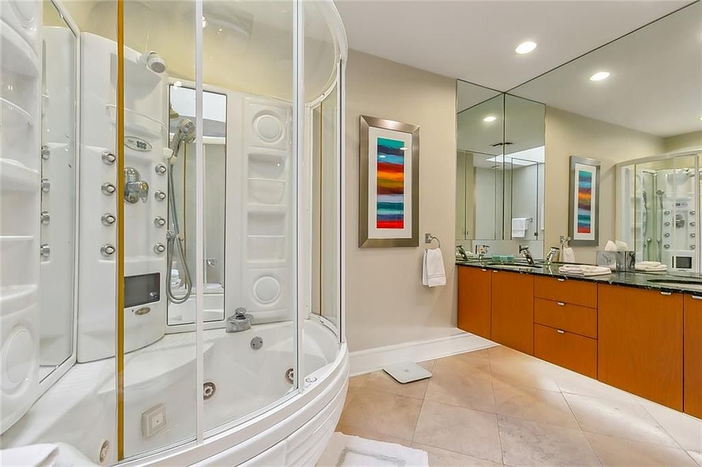 A spacious and luxurious bathroom features a curved glass-enclosed shower and tub combo with multiple jets, offering a spa-like experience perfect for families seeking both relaxation and functionality. Contemporary warm wood cabinetry runs along one wall, topped by a glossy black countertop with dual sinks, ideal for busy mornings. Large mirrored walls expand the sense of space while enhancing light, making the room feel bright and inviting. Pops of color from vibrant abstract artwork add personality to the neutral color scheme of soft beige walls and light floor tiles, creating an elegant, welcoming environment suitable for all ages.