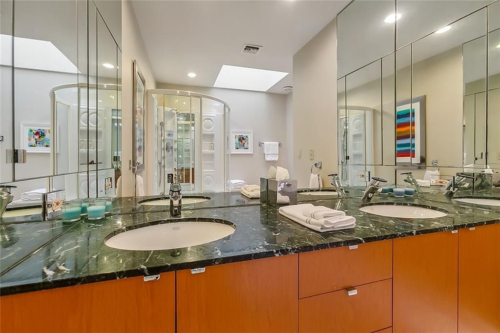 A spacious double vanity bathroom with a sleek, contemporary design perfect for family living. The black marble countertop features dual sinks and modern fixtures, while extensive mirrored cabinetry above offers both style and storage. Warm wood cabinetry below contrasts beautifully with the cool tones of the counter and mirrors. The room is well-lit by recessed ceiling lights and a large skylight, providing ample natural light. Soft white and pastel decor, along with colorful modern art, adds a cheerful touch. Thoughtfully placed essentials, such as folded towels and tissues, make this a welcoming and practical space for daily routines.