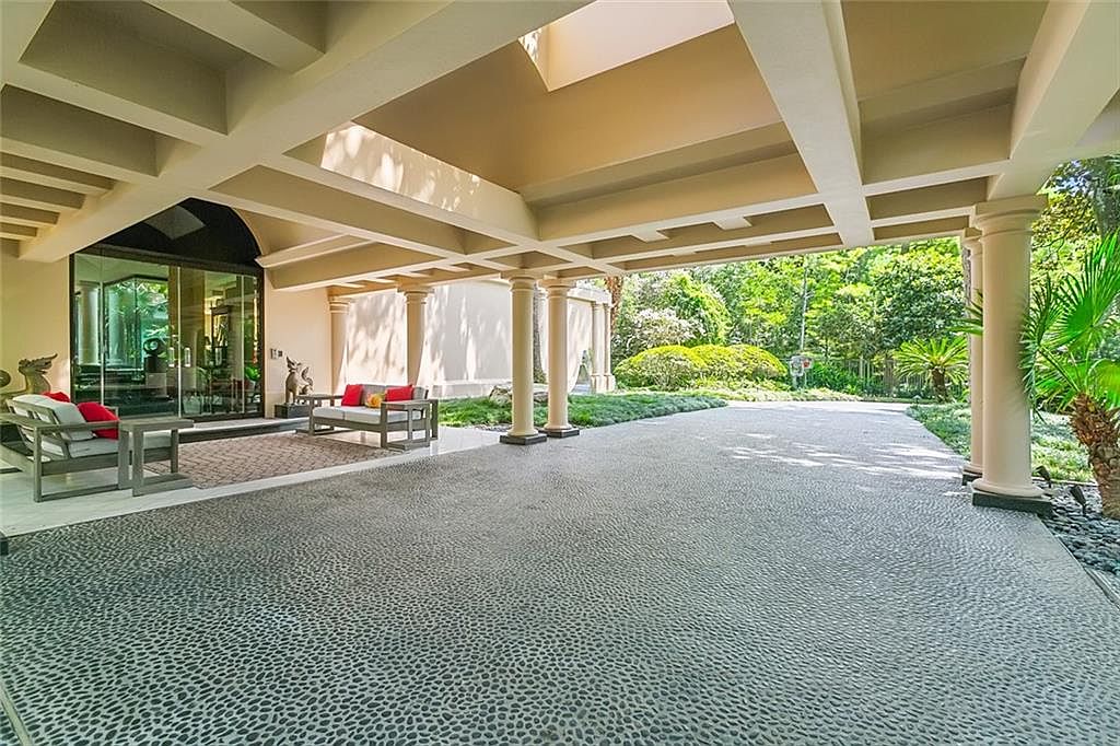 A spacious covered patio welcomes guests with its open layout, high coffered ceiling, and elegant columns. Natural light floods the area through wide skylights, enhancing the soft beige palette and subtle architectural detailing. Comfortable, family-friendly seating areas with contemporary outdoor furniture and pops of color from red and yellow accent pillows make this space inviting for gatherings or quiet relaxation. The textured stone flooring is both stylish and practical for all ages, while large glass doors connect the inside to verdant gardens. Mature landscaping and lush greenery frame the entrance, providing privacy and a serene atmosphere for everyone to enjoy.