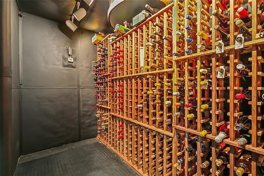 An intimate wine cellar boasts custom-built wooden racks extending from floor to ceiling, efficiently organizing an extensive collection of bottles. Soft, focused lighting overhead creates a warm ambiance that highlights the craftsmanship of the natural wood and provides excellent visibility. The dark, insulated walls and flooring maintain an ideal, temperature-controlled environment for preserving and aging wine. Thoughtful design ensures easy access while keeping the storage space uncluttered and functional, making it suitable for both daily family use or sophisticated entertaining. The room blends practicality with elegance, balancing modern storage solutions and a cozy, inviting feeling.