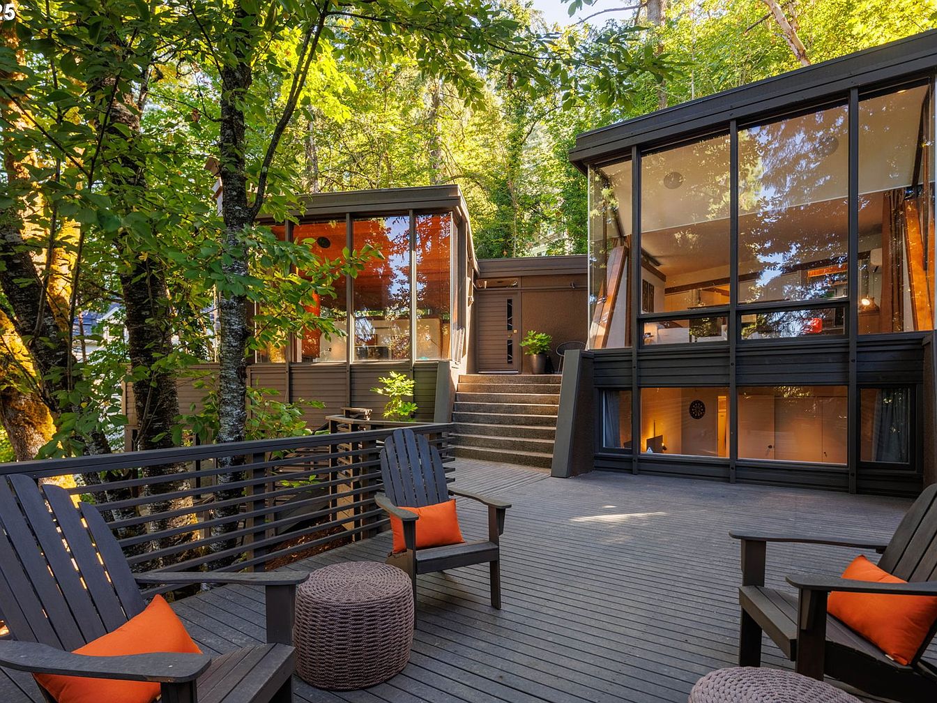 Spacious deck surrounded by mature trees provides an inviting gathering area at the center of a modern home. Large glass walls connect indoor spaces with the forested outdoors, filling the interior with natural light and offering tranquil views. The patio features sturdy Adirondack chairs with bright orange cushions and woven ottomans, ideal for relaxed family moments or entertaining guests. Neutral gray decking harmonizes perfectly with the understated exterior architecture, while simple potted plants add a welcoming touch. Step-up entryways and wide pathways ensure easy movement for all ages, making this retreat both stylish and exceptionally family friendly.
