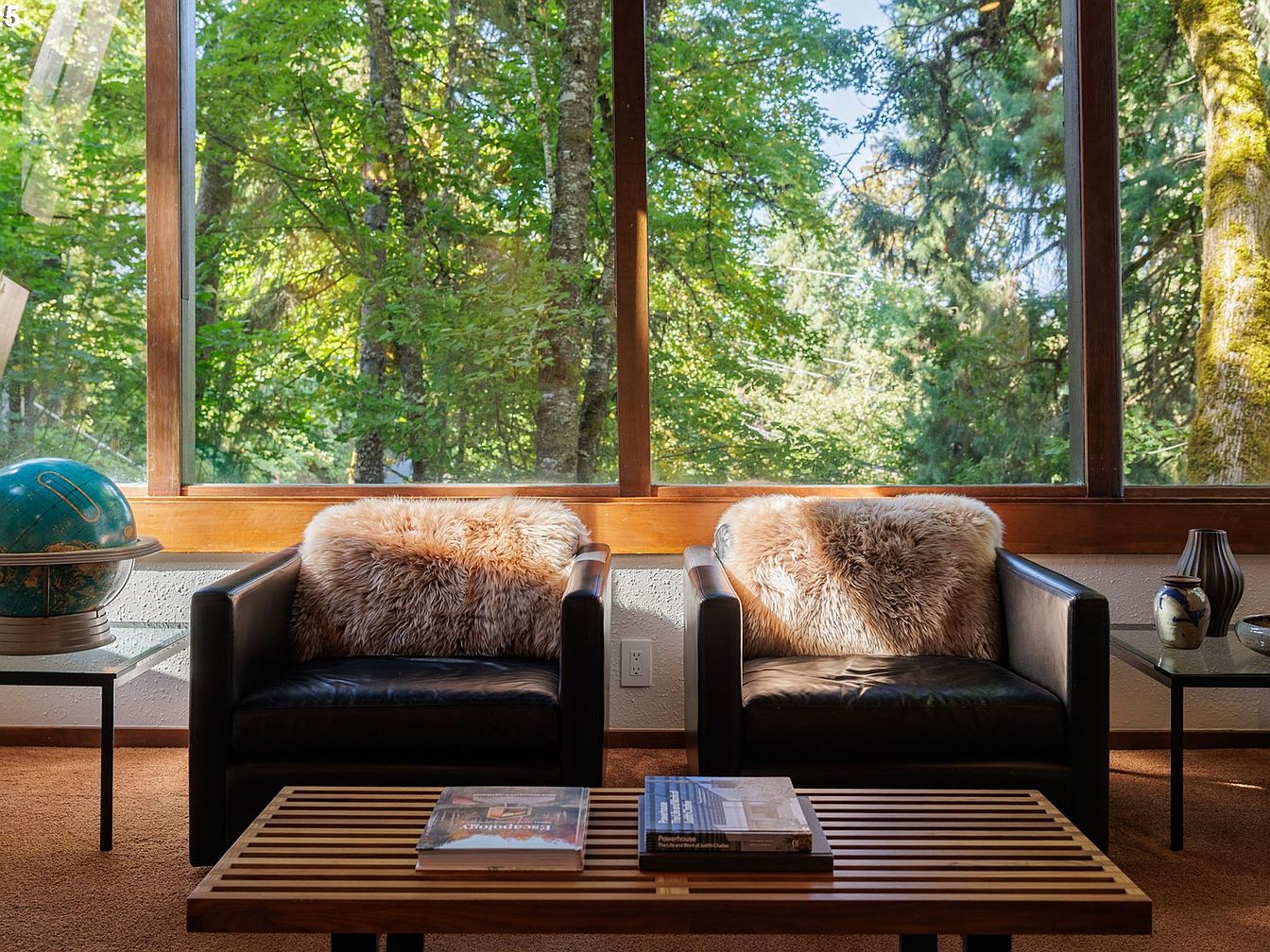 Cozy and inviting, this sitting area is designed to capture the serenity of the lush outdoor scenery through expansive floor-to-ceiling windows. Two black leather armchairs, each topped with a plush fur throw, offer a comfortable spot for relaxation or family conversations. The neutral brown carpeting and wooden window trim harmonize with the natural surroundings, enhancing the tranquil atmosphere. A modern slatted coffee table and glass side tables add functionality, while decorative pieces like a vintage globe and ceramic vases reflect subtle sophistication. This layout makes an ideal space for reading, bonding, or enjoying nature’s beauty year-round.