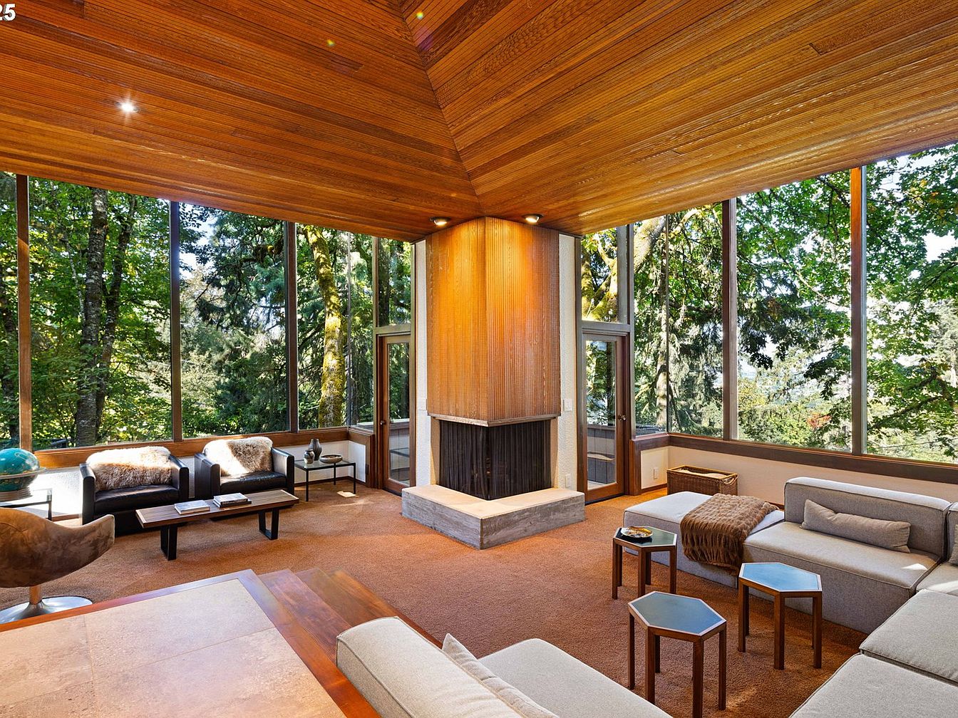 A stunning sunken living room features a large sectional sofa arranged for both relaxation and social gatherings, making it ideal for family lounging or movie nights. Warm wood tones span the ceiling and accent the dramatic fireplace, blending harmoniously with the earthy carpet to foster a cozy, inviting atmosphere. Expansive floor-to-ceiling windows flood the space with natural light and frame lush outdoor views, creating a seamless indoor-outdoor connection. Modern artwork and throw pillows add pops of color and personality. Built-in wooden steps provide easy access, enhancing flow and making the area accessible and welcoming for all family members.