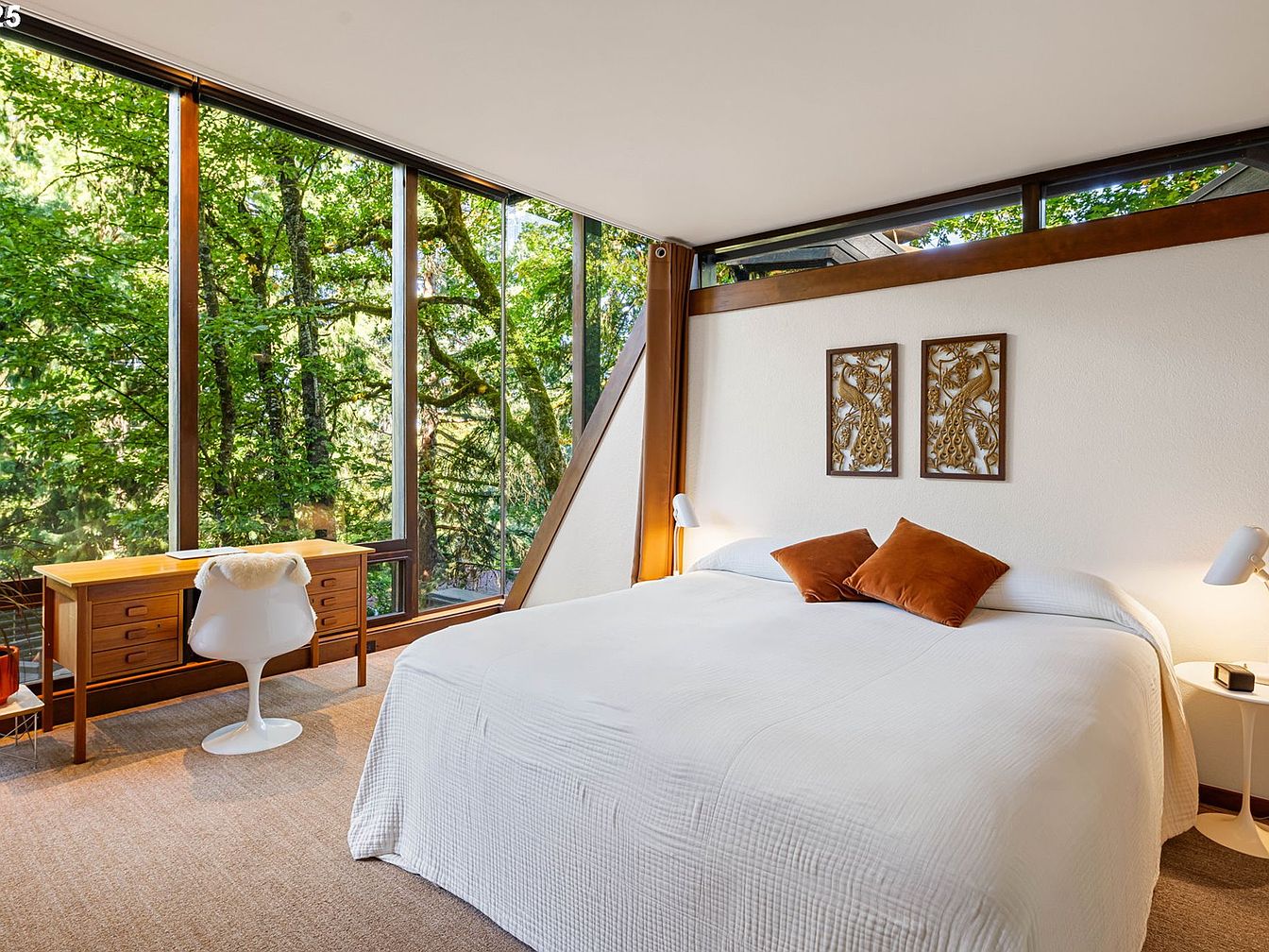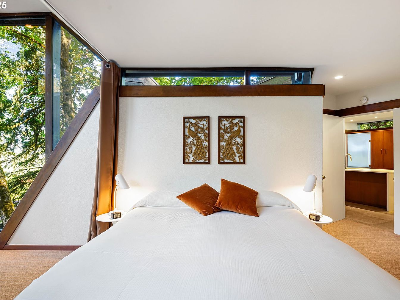 This serene bedroom is designed with floor-to-ceiling windows that offer breathtaking views of lush trees, creating a tranquil and refreshing backdrop. The room features a large bed adorned with a crisp white cover and accented by warm rust-colored throw pillows, enhancing the cozy yet modern feel. A mid-century modern desk sits against the window, paired with a sleek white chair, making it perfect for work or creativity in natural light. Soft carpeting adds warmth for family comfort, while wall-mounted lamps and distinctive gold-toned art above the bed bring personality and charm to the space.