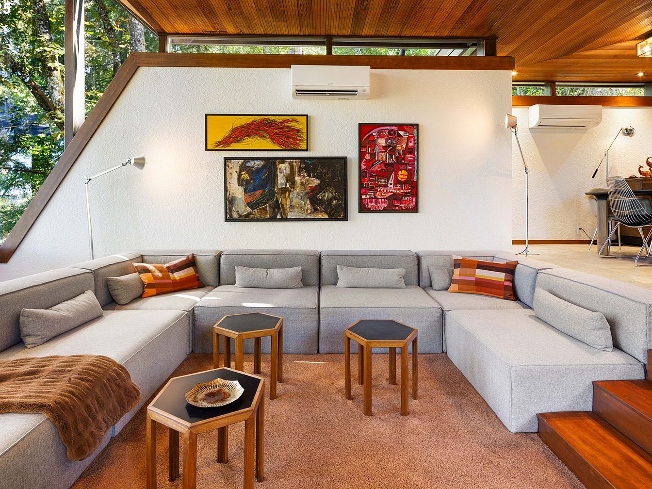A welcoming sunken living room with expansive sectional seating, ideal for family gatherings or entertaining guests. The room features warm wood-paneled ceilings and abundant natural light from the striking floor-to-ceiling windows, creating a cozy and bright atmosphere. Soft neutral tones dominate the color scheme, highlighted by the grey sectional sofa adorned with earth-toned throw pillows and a plush rust-colored blanket for added comfort. The space is accented with modern, geometric coffee tables and vibrant artwork that adds personality to the walls. Open sightlines connect the living area to the dining and workspace above, promoting a sense of openness and togetherness.