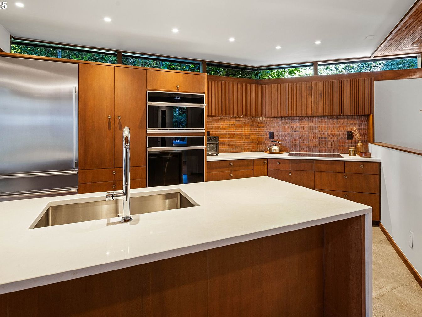 A spacious modern kitchen features sleek white countertops and rich wooden cabinetry that adds warmth and elegance to the home. The layout boasts a large central island with an integrated sink, perfect for meal prep or casual family gatherings. Full-height cabinets and built-in stainless steel appliances maximize storage and utility while maintaining a seamless aesthetic. Warm amber-toned backsplash tiles create visual interest and complement the cabinetry. Continuous clerestory windows provide natural light and offer a view of surrounding greenery, enhancing the sense of openness. The design prioritizes both functionality and comfort, making it ideal for family living and entertaining.