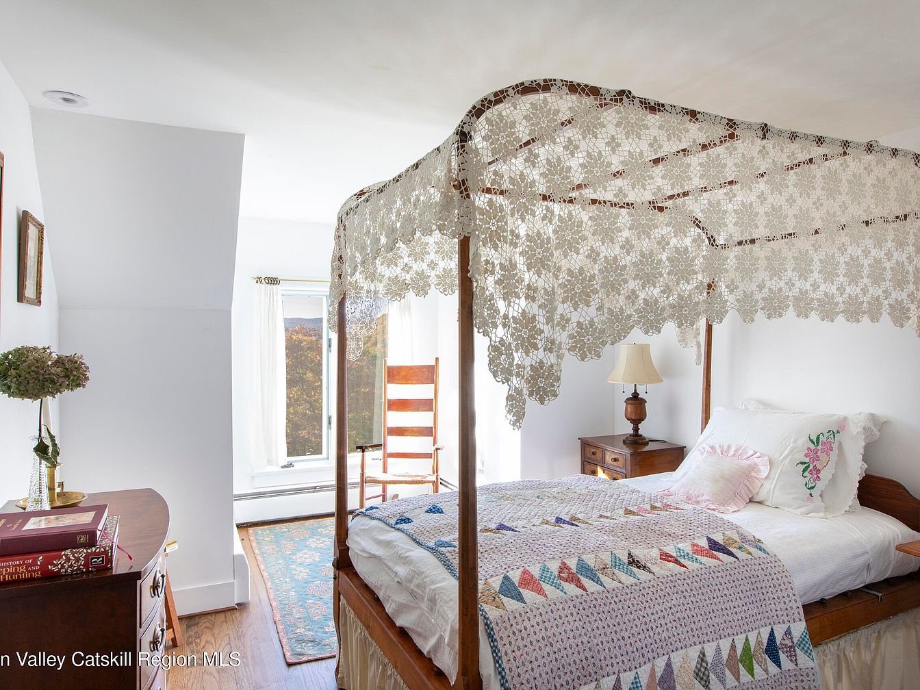 This inviting bedroom features a beautifully crafted wooden canopy bed adorned with delicate lace fabric, creating an enchanting focal point. The light color palette enhances the room’s airy feel, complemented by soft white walls and warm wooden flooring. A charming quilt with colorful triangle patterns adds a touch of cozy style, harmonizing with the floral and textured throw pillows. A wooden nightstand, paired with a classic lamp, provides both functionality and warmth. Natural light pours through large windows, highlighting picturesque views and inviting the outdoors in, while an elegant rocking chair offers a serene spot to relax.