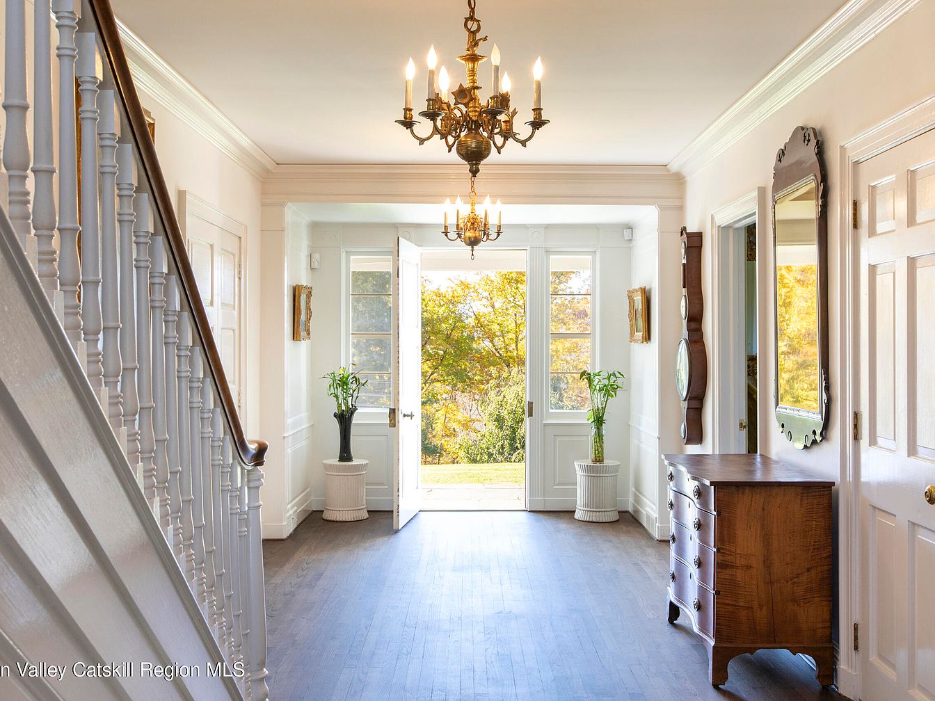 This welcoming entryway features a stunning design, harmoniously blending classic and modern elements. A grand chandelier illuminates the space, while the gracefully curved staircase invites guests upward. The rich, dark hardwood flooring complements the soft white walls, adorned with tasteful mirrors and framed artwork. Natural light pours in through the large double doors, creating an airy atmosphere and connecting the indoors with the lush exterior. Potted plants add a touch of greenery, enhancing the family-friendly vibe. A charming antique dresser adds functionality, making it an ideal spot for keys and mail, merging style with practicality.