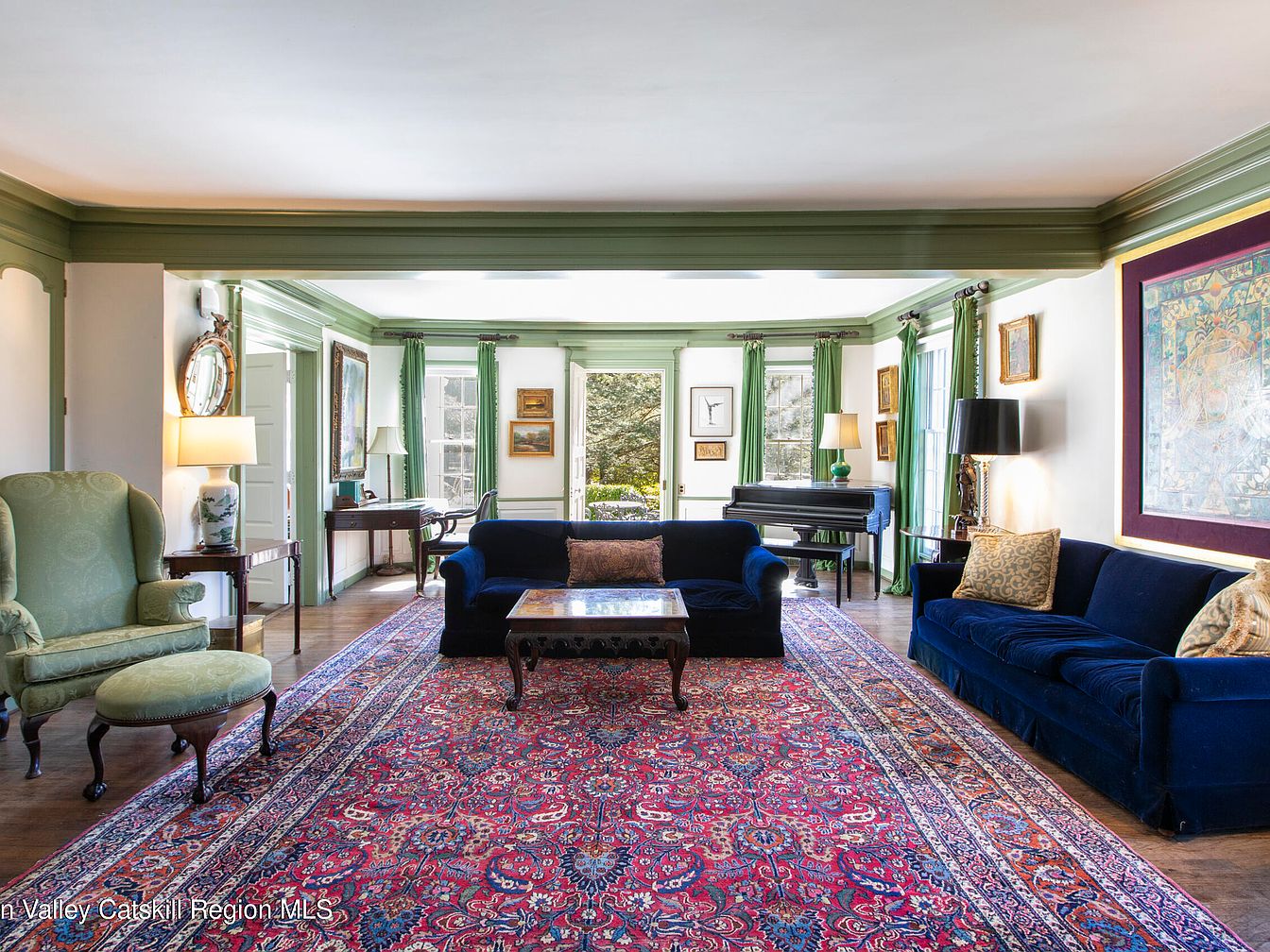 Elegantly designed, this living room boasts a spacious layout accented by classic architectural details. The soft green trim complements the warm beige walls, harmonizing with the rich blue velvet sofas. An intricate Persian rug lays underfoot, inviting comfort and warmth. Family-friendly features include ample seating, with a cozy armchair adding a touch of character. Natural light floods the space through large windows, framed by lush green curtains. Decorative art pieces lend personality, including framed paintings and a striking tapestry. A grand piano enhances the room’s sophistication, creating an inviting atmosphere perfect for both relaxation and entertainment.