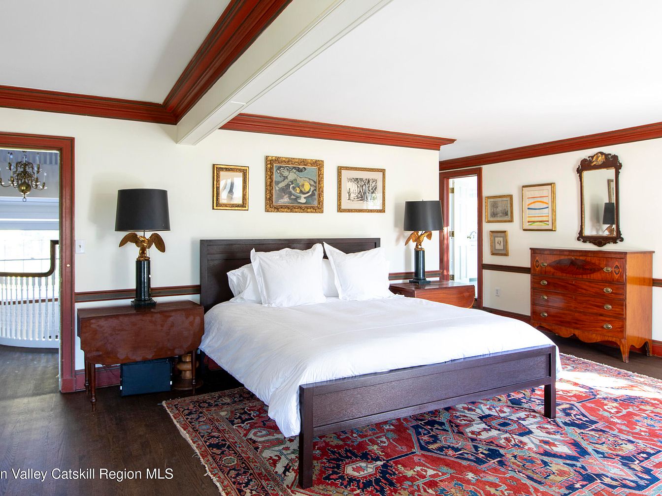 This master bedroom showcases a blend of traditional elegance and modern comfort. Rich hardwood floors complement the soft, neutral walls, accentuated by deep red crown molding that adds warmth and dimension. The centerpiece is a dark wood platform bed, framed by stylish nightstands topped with sophisticated black lamps featuring eagle motifs. An ornate wooden dresser and a vintage mirror enhance the room’s character, while curated artwork adds a personal touch. A vibrant area rug ties the space together, providing a cozy atmosphere. The layout promotes relaxation and tranquility, making it perfect for restful nights and morning reflections.