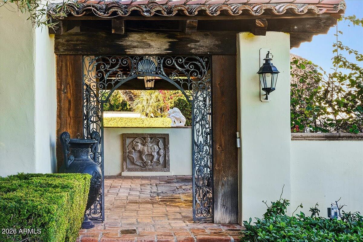 This enchanting entryway features an ornate wrought iron gate, seamlessly blending craftsmanship with elegance. The rustic wooden beams complement the terracotta tile flooring, providing a warm welcome. Lush greenery frames the entrance, enhancing the inviting ambiance. A vintage lantern casts a gentle glow, perfect for evening arrivals. The intricate stonework at the far end visually draws guests in, highlighting artistic details that speak to the home’s character. This harmonious design fosters a family-friendly atmosphere, encouraging connection with nature and an inviting space for gatherings. It’s a perfect introduction into the serene beauty that awaits inside.