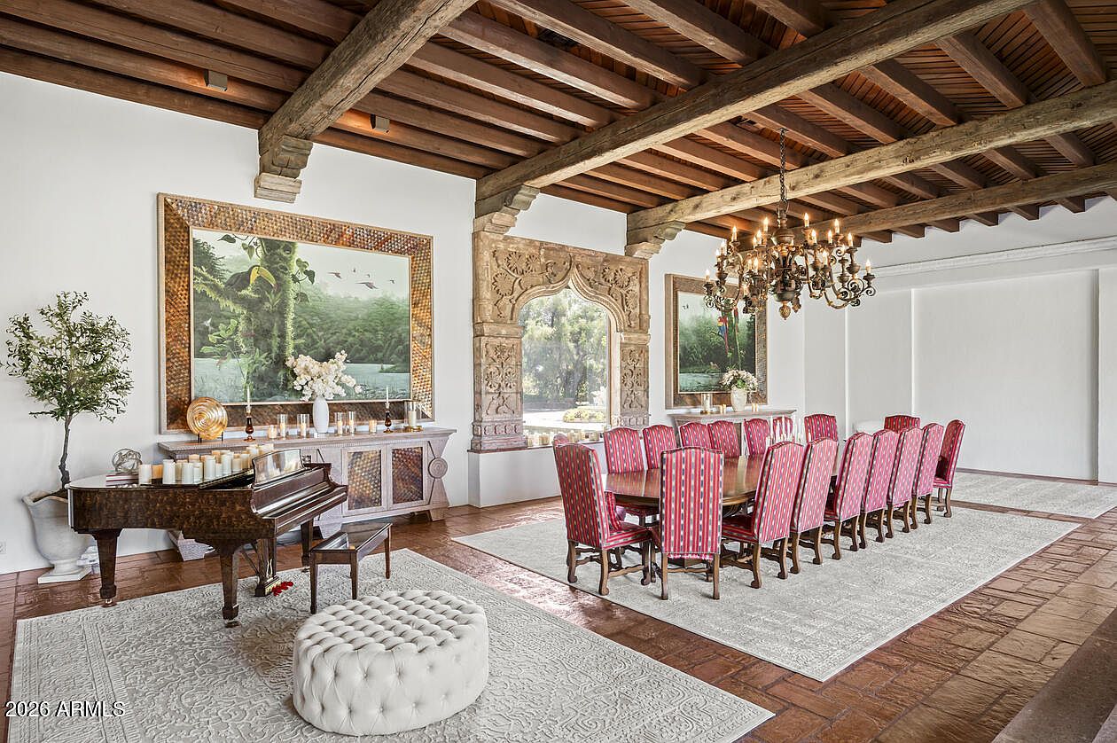 This stunning dining room features a grand table surrounded by elegant chairs, showcasing a striking red and gold fabric that exudes warmth and sophistication. The rich wooden beams overhead complement the rustic charm of the exposed ceiling, while the intricately designed stone archway adds a touch of artistry. A polished grand piano invites melodious gatherings, enhancing the family-friendly atmosphere. A plush, tufted ottoman provides additional seating, perfectly paired with soft, light-hued area rugs that anchor the space. Framed botanical artwork serves as a visual focal point, harmonizing nature’s beauty with the refined ambiance.