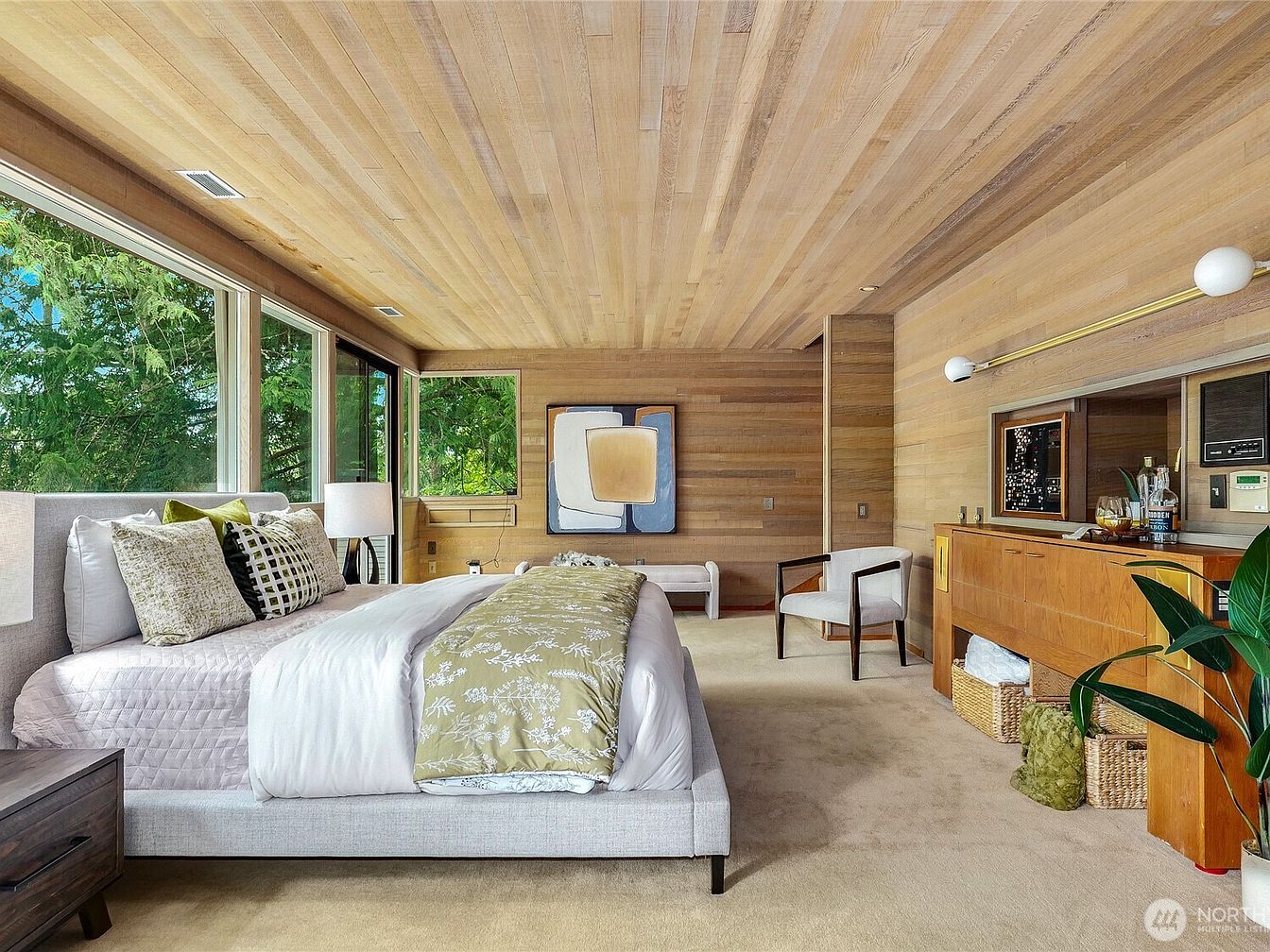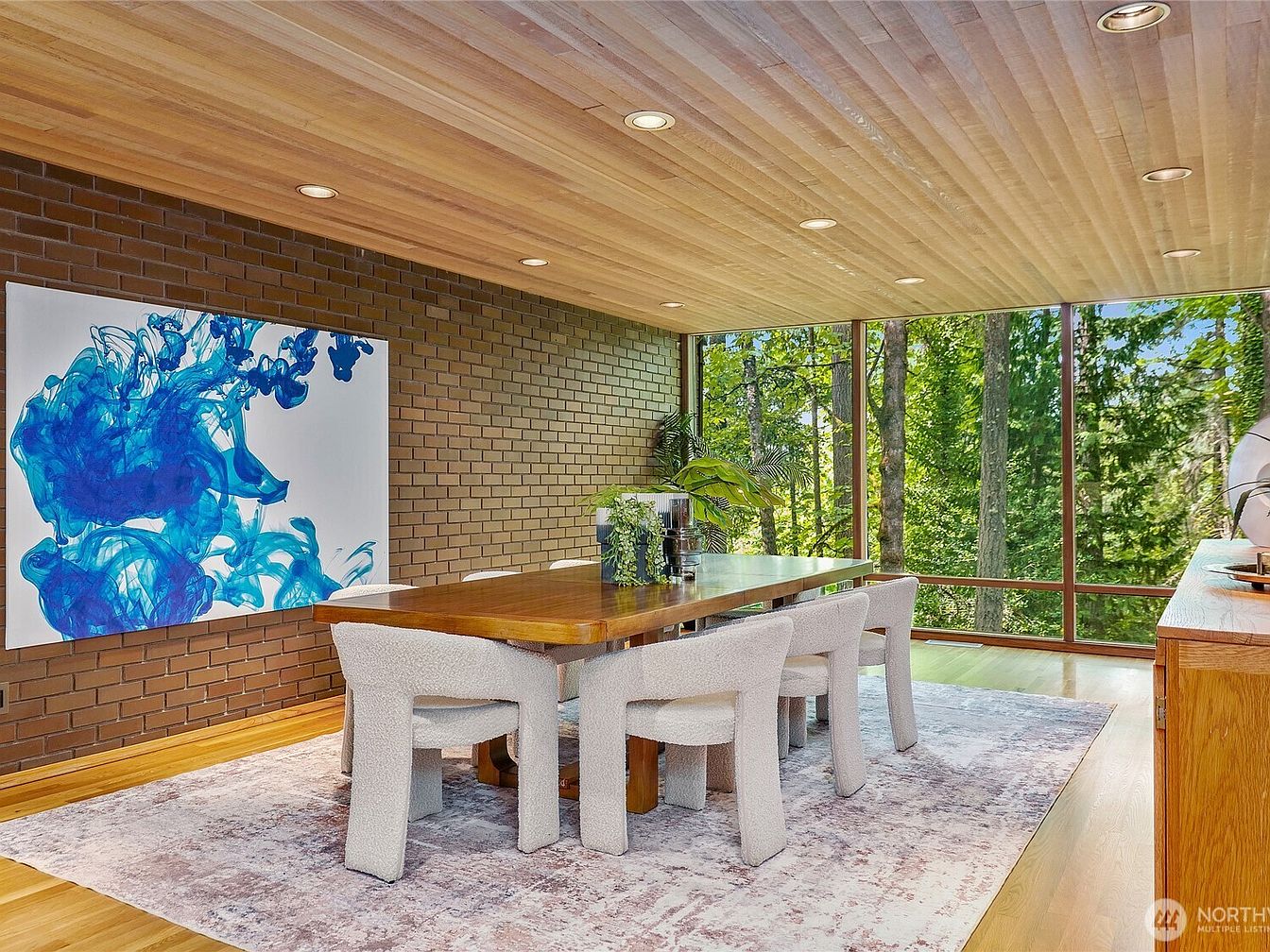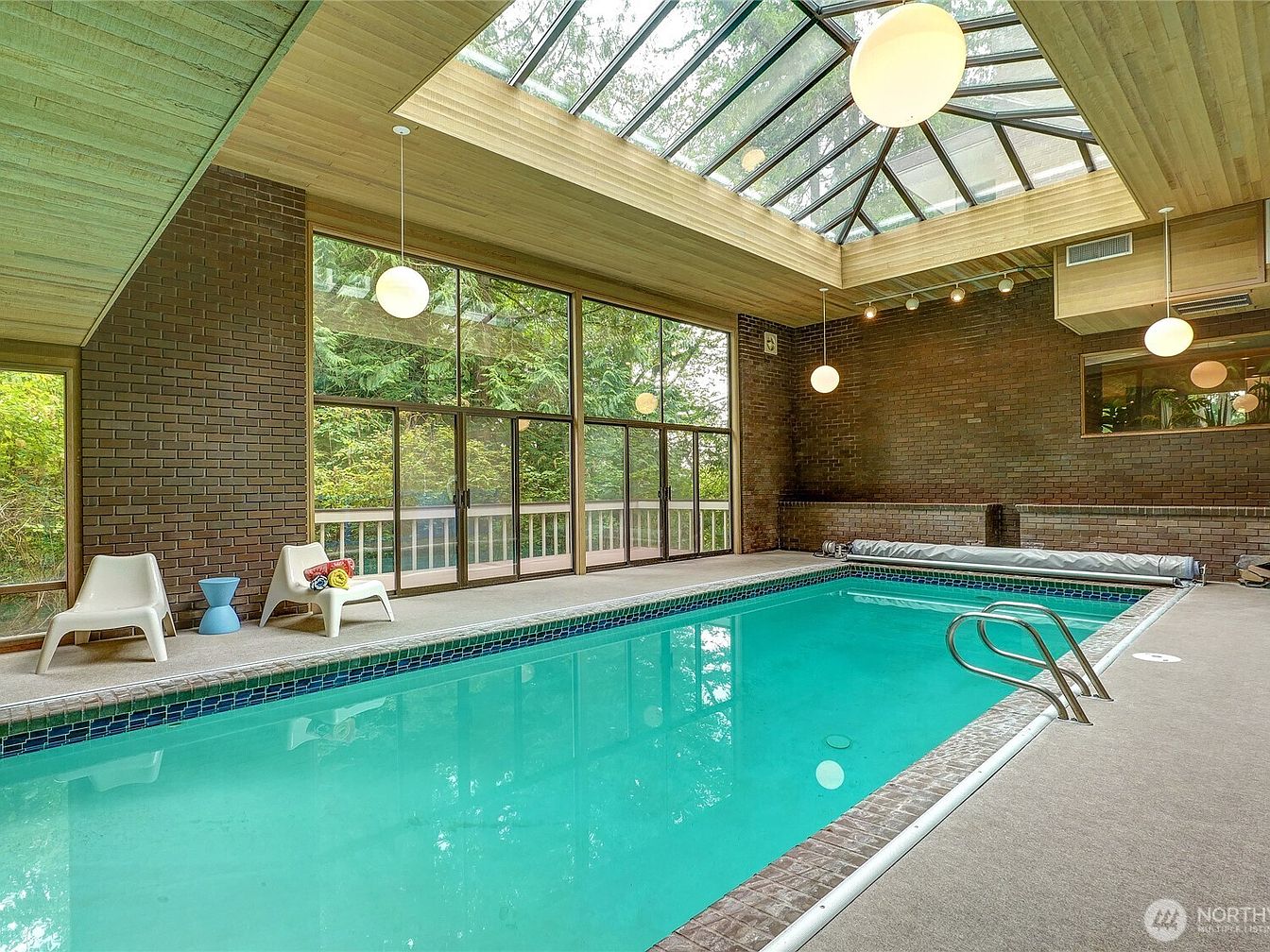 This architectural masterpiece, inspired by Frank Lloyd Wright and designed by Larry Woodin, embodies the essence of Mid-Century Modern design and offers a promising future for any success-oriented individual. Located on over 5 private acres with breathtaking views of Mt. Rainier, this 7480 sq. ft. home features 3-5 bedrooms and 4.5 baths, showcasing floor-to-ceiling glass walls and remarkable brickwork. Recently renovated, it includes an indoor pool, theater, and flexible living spaces, ideal for both relaxation and productivity. Situated near Issaquah and Bellevue, and priced at $3,189,000, this home combines luxurious living with exclusivity, making it a true art piece amidst nature’s serenity.