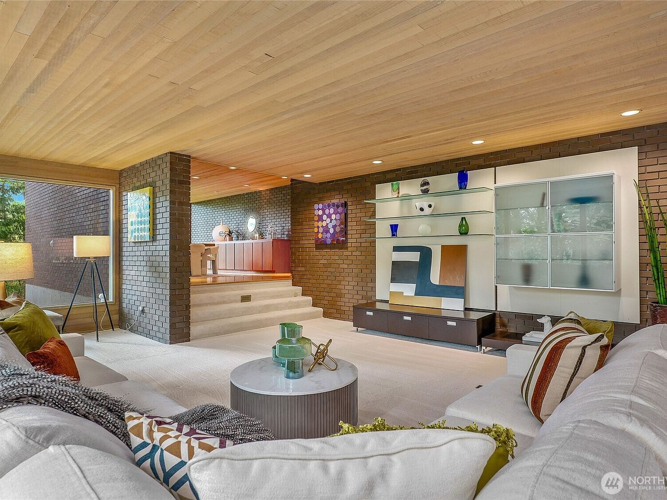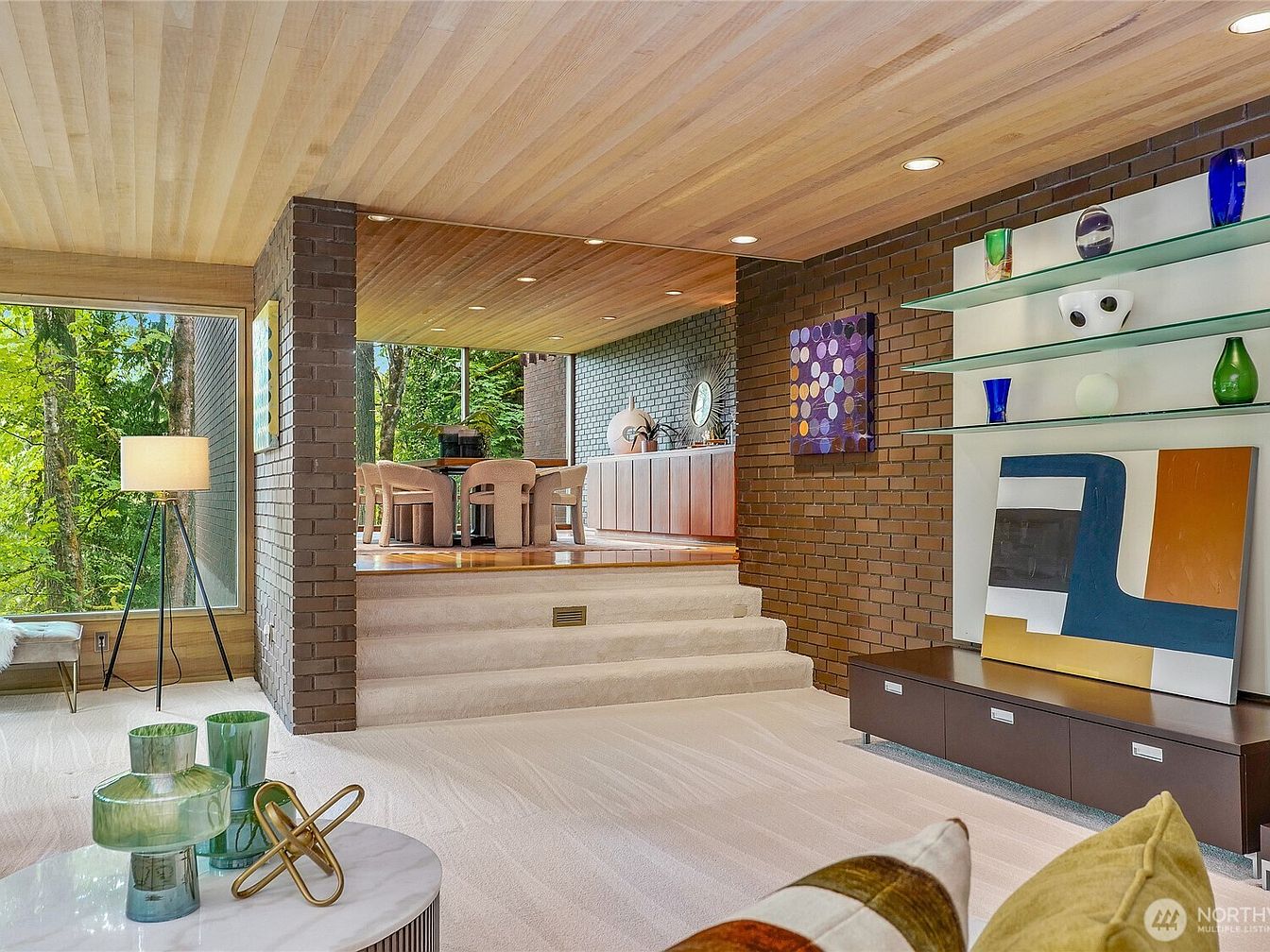 This spacious living room showcases a harmonious blend of contemporary architecture and natural beauty. The warm wooden ceiling complements the rich, textured brick walls, creating a cozy yet modern atmosphere. Large windows invite ample natural light, framing serene views of lush greenery. Plush seating in soft shades enhances comfort, ideal for family gatherings. An artistic display of colorful decor pieces adds personality and vibrancy, while the strategic layout promotes an open flow to the dining area in the background. A subtle, neutral color palette coupled with carefully chosen furnishings makes this space both inviting and stylish.