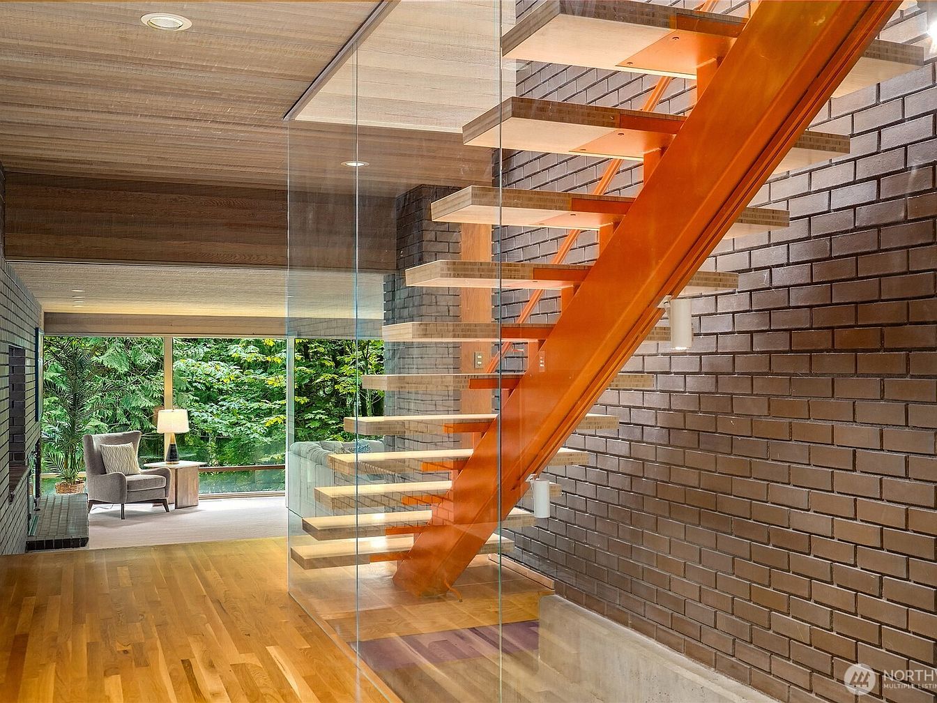 This stunning staircase serves as a focal point in a modern home, blending elegance with functionality. The open design features a striking orange metal rail that complements the warm wooden treads, creating a vibrant contrast against the textured gray brick wall. Natural light floods the space through expansive windows, highlighting the smooth hardwood flooring, which seamlessly integrates the living area beyond. A cozy seating arrangement, complete with a stylish armchair and lamp, invites relaxation while overlooking lush greenery. This layout emphasizes family-friendly living, encouraging connection and movement throughout the home with its open concept.
