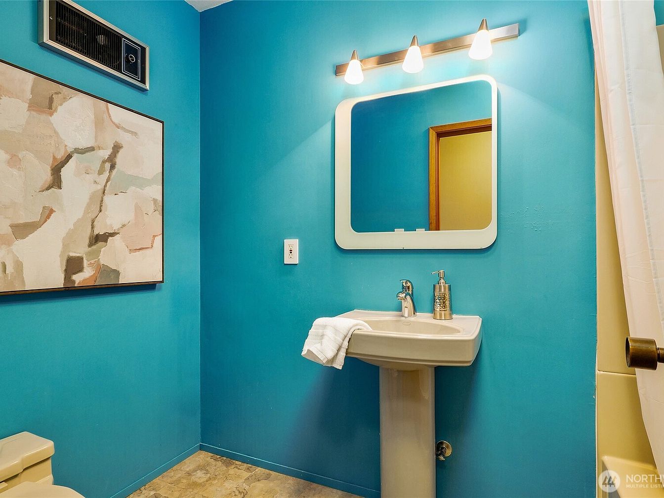 This bathroom features a striking turquoise backdrop that brings a refreshing vibrancy to the space. A contemporary pedestal sink is paired with sleek chrome fixtures, enhancing its modern aesthetic. Above the sink, a stylish mirror framed in white complements the color scheme and adds a touch of brightness. The carefully chosen artwork on the wall introduces soft hues of pink and beige, providing artistic contrast against the vivid walls. Efficient lighting from three ceiling fixtures creates a warm ambiance while promoting functionality. Practical elements, like the space-efficient layout, make it ideal for family use, ensuring comfort and style coexist beautifully.