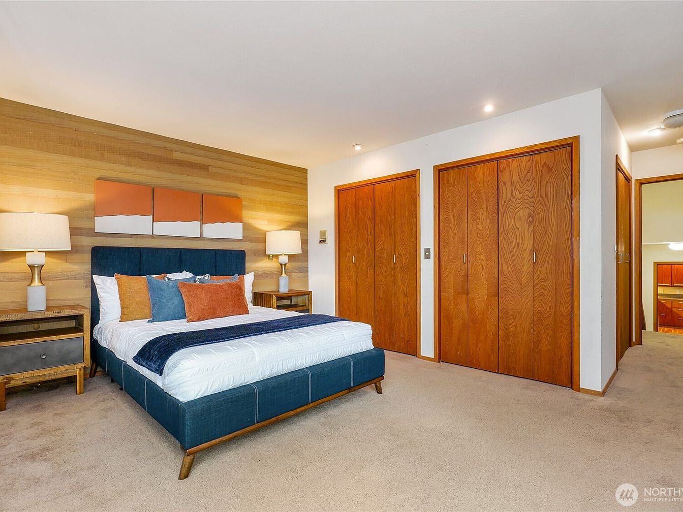 This serene master bedroom boasts a contemporary design with a cozy ambiance. The room features a plush blue upholstered bed, adorned with vibrant accent pillows, creating a stylish focal point. Warm wood paneling behind the bed complements the soft beige carpeting for a neutral yet inviting color scheme. Two elegant lamps on bedside tables offer soft lighting, enhancing the relaxing atmosphere. Ample storage is provided by sleek wooden closets, seamlessly integrated into the layout. A perfect blend of comfort and functionality makes this space ideal for restful nights, while its warm tones ensure a family-friendly environment.
