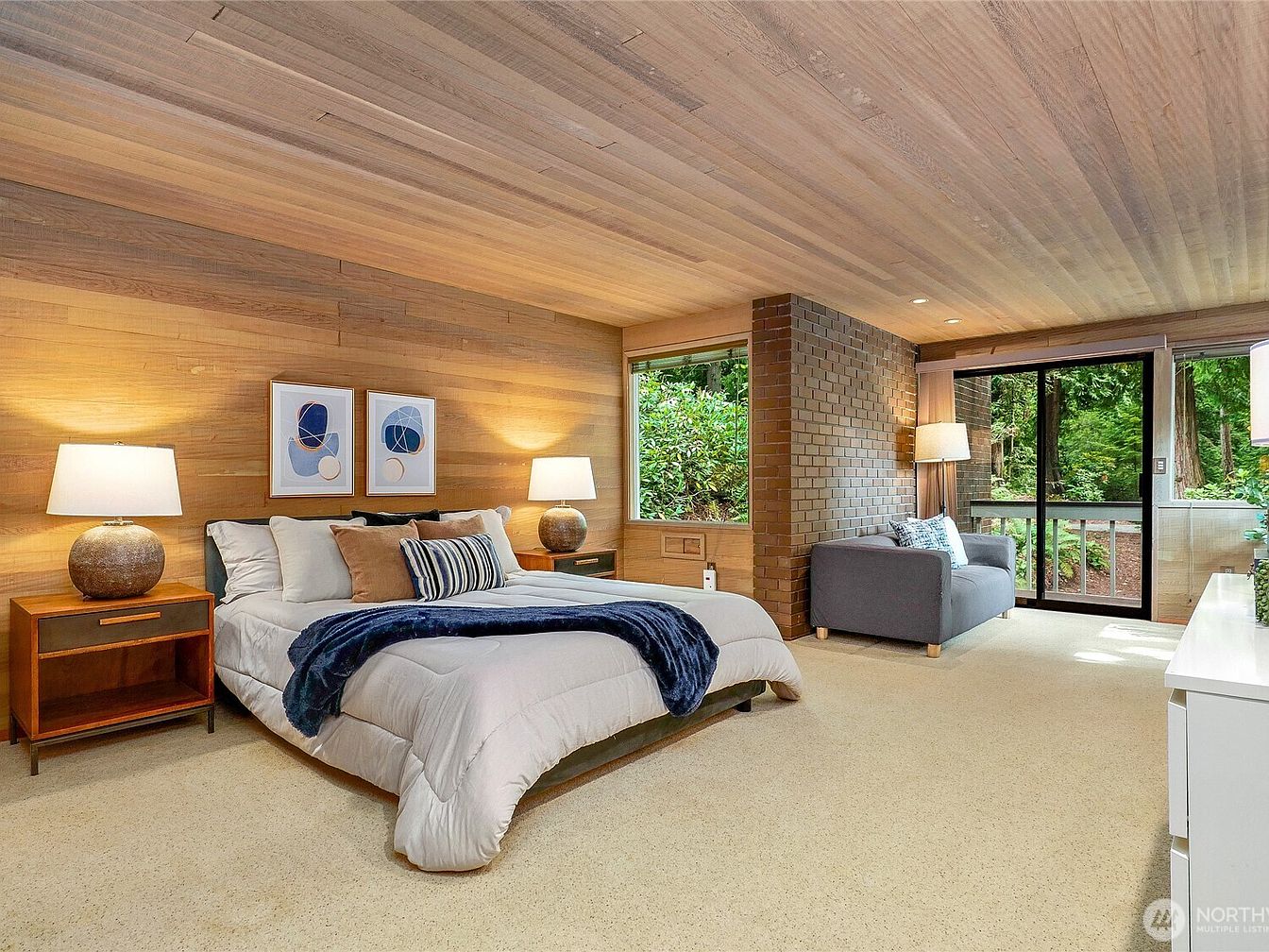 This serene master bedroom showcases a harmonious blend of natural materials and modern design. The warm wood-paneled walls and ceiling create an inviting atmosphere, enhanced by soft beige carpet underfoot. A plush queen-sized bed, adorned with cozy throws and accent pillows, invites relaxation. Stylish bedside tables with gentle lighting flank the bed, adding a touch of elegance. The brick feature wall introduces a rustic element, while large windows frame views of the lush outdoor landscape, inviting natural light. A comfortable seating area with a contemporary sofa completes the space, making it a perfect family-friendly retreat.