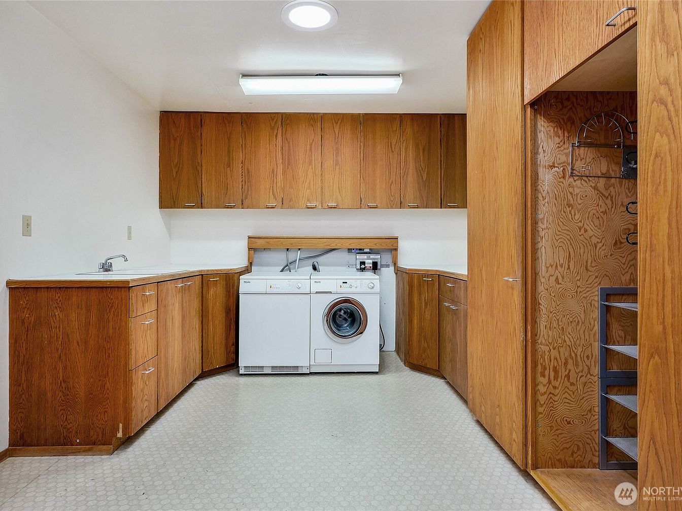 This spacious laundry room features a practical layout, emphasizing functionality with ample cabinetry crafted from warm wood tones. The efficient design includes a deep sink and a modern washing machine, ensuring convenience for everyday tasks. The light-colored flooring contrasts nicely with the rich, golden hues of the cabinetry, creating a balance of warmth and brightness. Family-friendly elements are evident, with plenty of counter space for folding laundry and built-in storage solutions for organization. Soft overhead lighting enhances visibility, while the layout invites seamless movement, making this a welcoming and efficient space for the entire household.